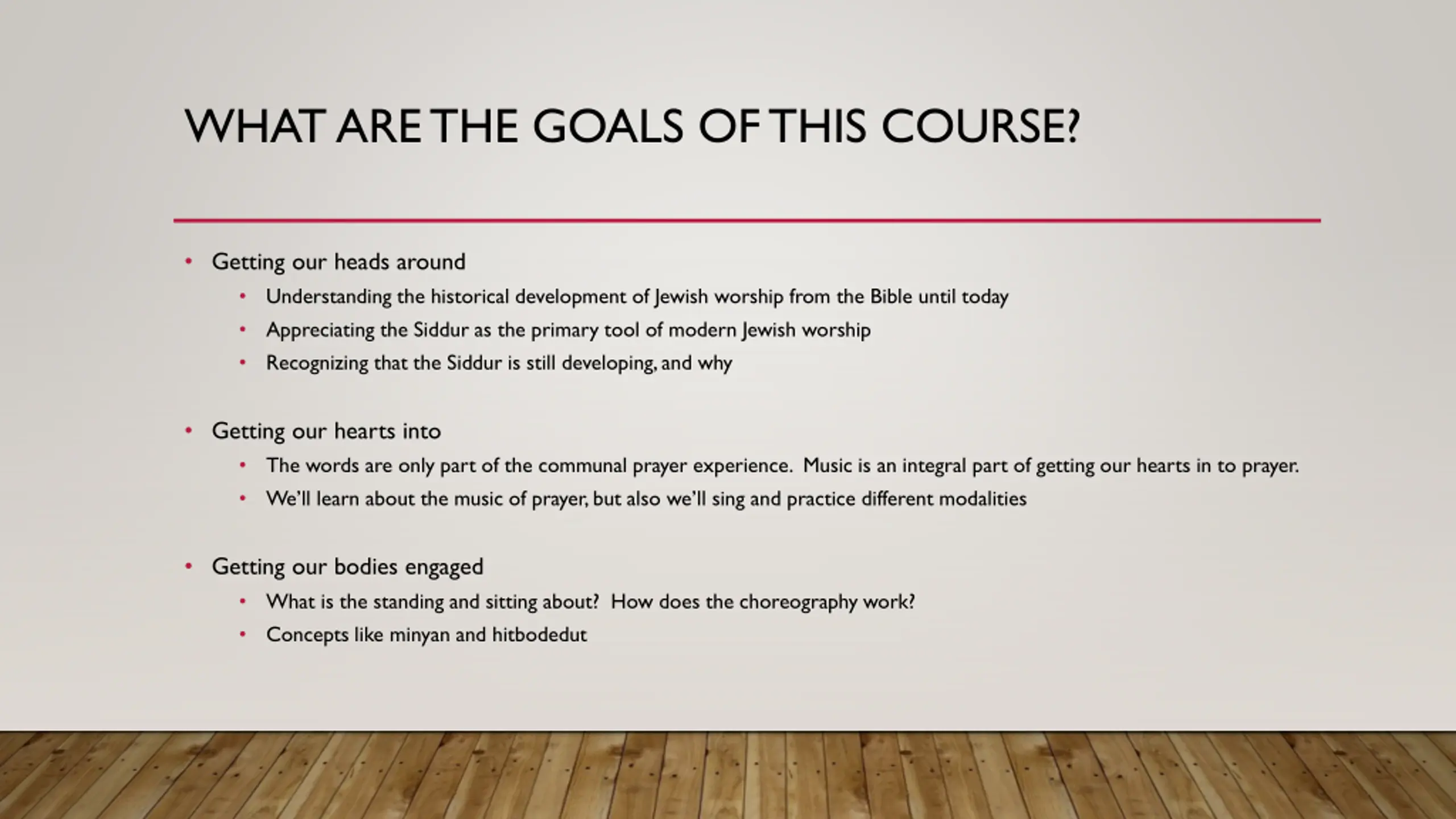 WHAT ARE THE GOALS OF THIS COURSE? Getting our heads around Understanding the historical development of Jewish worship from the Bible until today Appreciating the Siddur as the primary tool of modern Jewish worship Recognizing that the Siddur is still developing, and why Getting our hearts into The words are only part of the communal prayer experience. Music is an integral part of getting our hearts in to prayer. We ll learn about the music of prayer, but also we ll sing and practice different modalities Getting our bodies engaged What is the standing and sitting about? How does the choreography work? Concepts like minyan and hitbodedut