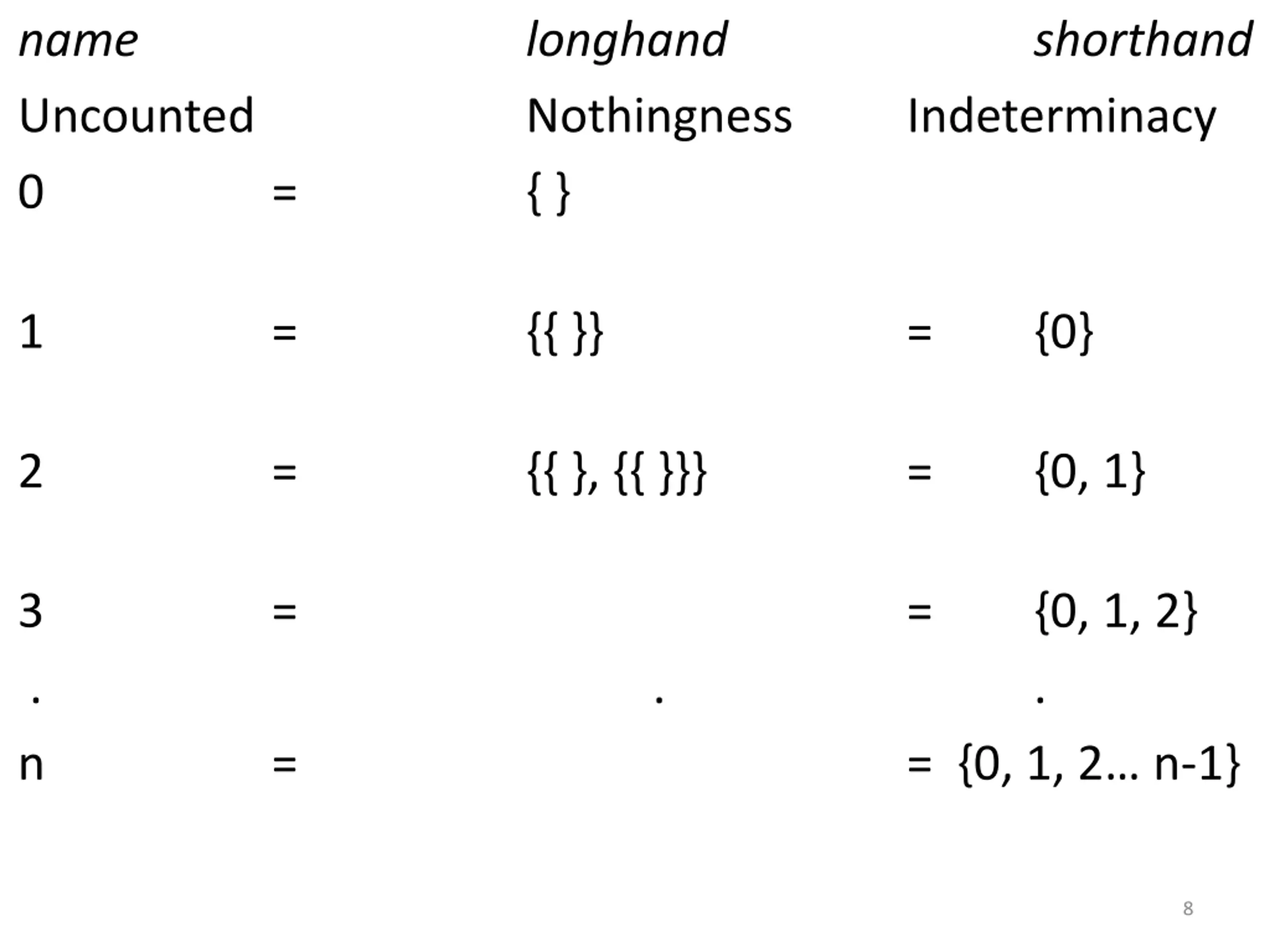 name Uncounted 0 1 2 3 . n longhand Nothingness { } Indeterminacy shorthand = = {{ }} = {0} = {{ }, {{ }}} = {0, 1} = = . = = {0, 1, 2 n-1} {0, 1, 2} . 8