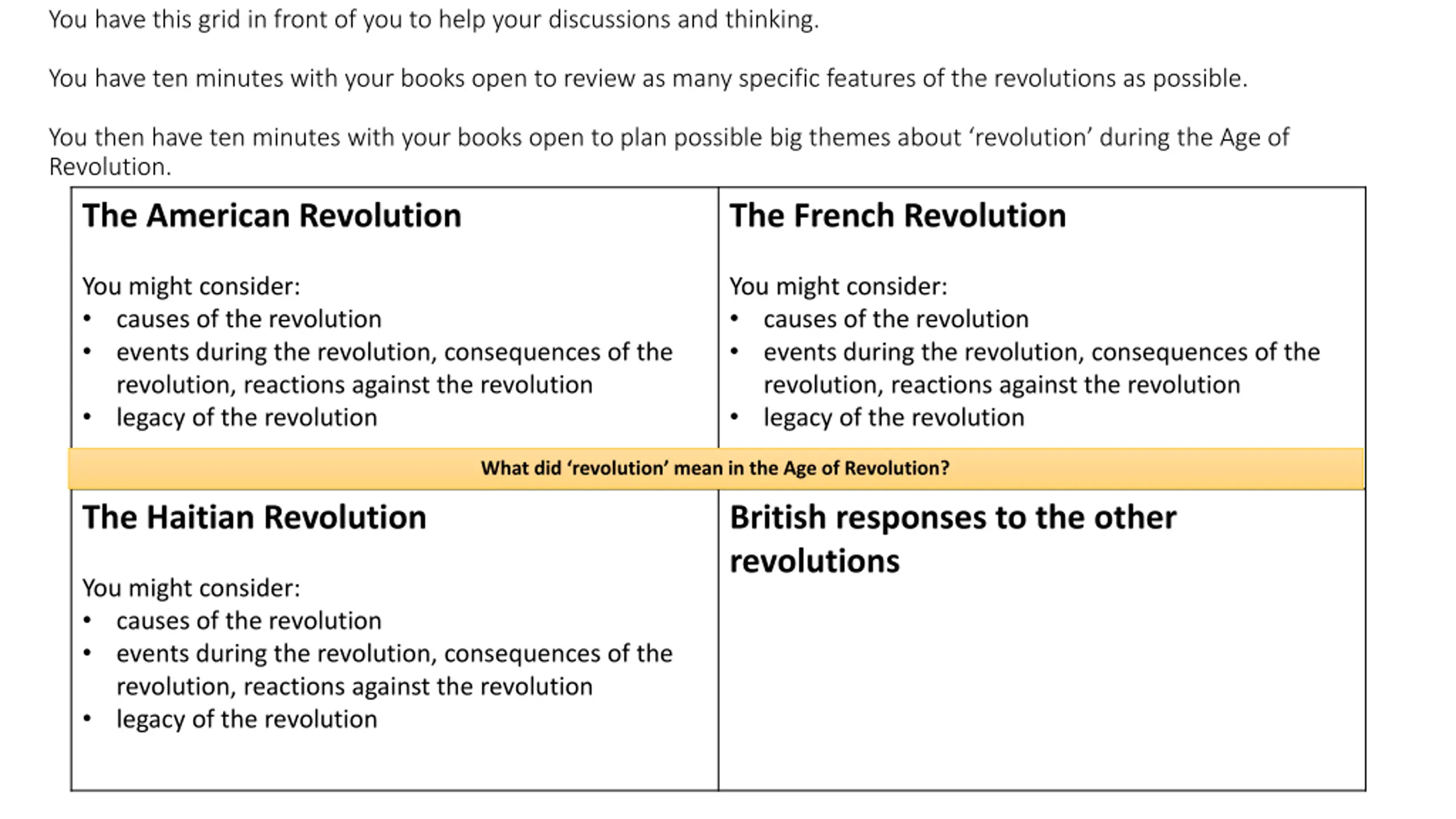 What did revolution mean during the Age of Revolution? You have 30 minutes to write an answer to this question. You must now close your books and put away any notes. We want to give you intellectual freedom to structure it in a way that makes sense to you. We strongly suggest that you briefly plan your answer. Can you identify some big themes about what revolution meant during the Age of Revolution? - Consider America, France, Haiti and Great Britain when planning your answer. - Consider who you are talking about and at what point during each revolution. - Try to choose different context-specific evidence to support your work. You will be credited for: - Bringing in precise contextual knowledge to support your claims. - Being complex and nuanced when explaining what revolution meant. - Focusing on the question: what did revolution mean?