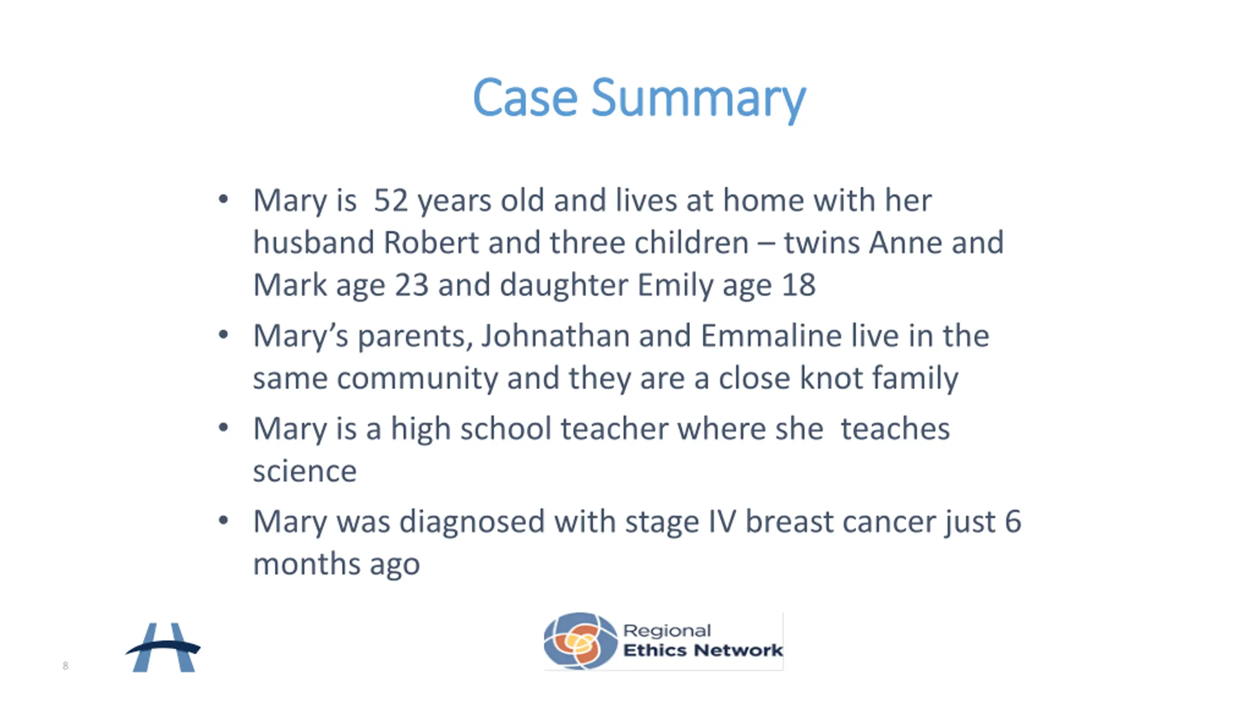 Case Summary Case Summary Mary is 52 years old and lives at home with her husband Robert and three children twins Anne and Mark age 23 and daughter Emily age 18 Mary s parents, Johnathan and Emmaline live in the same community and they are a close knot family Mary is a high school teacher where she teaches science Mary was diagnosed with stage IV breast cancer just 6 months ago 8