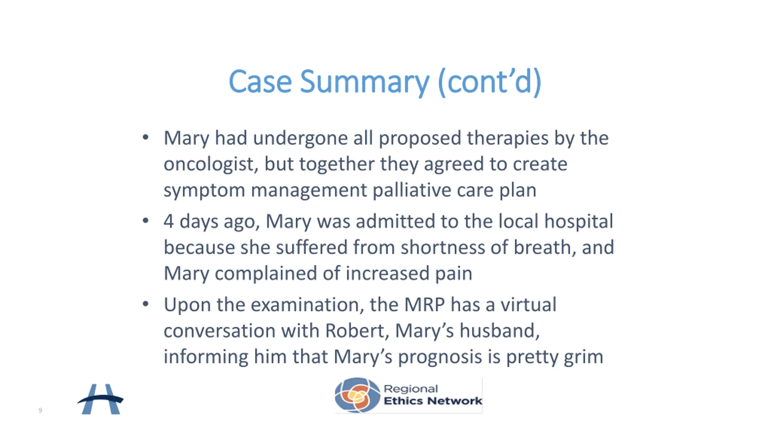 Case Summary (contd) Case Summary (cont d) Mary had undergone all proposed therapies by the oncologist, but together they agreed to create symptom management palliative care plan 4 days ago, Mary was admitted to the local hospital because she suffered from shortness of breath, and Mary complained of increased pain Upon the examination, the MRP has a virtual conversation with Robert, Mary s husband, informing him that Mary s prognosis is pretty grim 9
