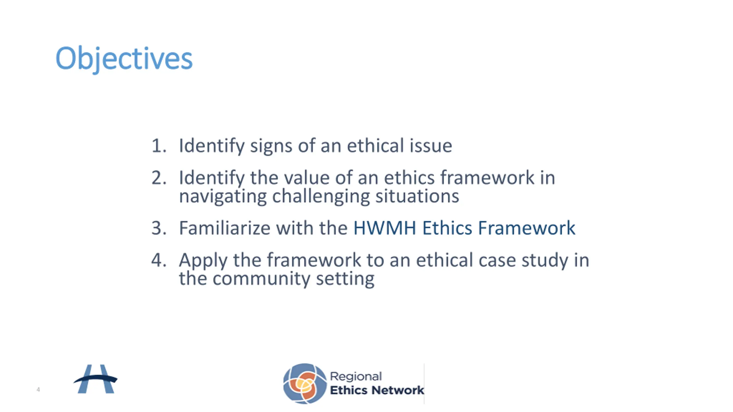 Objectives Objectives 1. Identify signs of an ethical issue 2. Identify the value of an ethics framework in navigating challenging situations 3. Familiarize with the HWMH Ethics Framework 4. Apply the framework to an ethical case study in the community setting 4