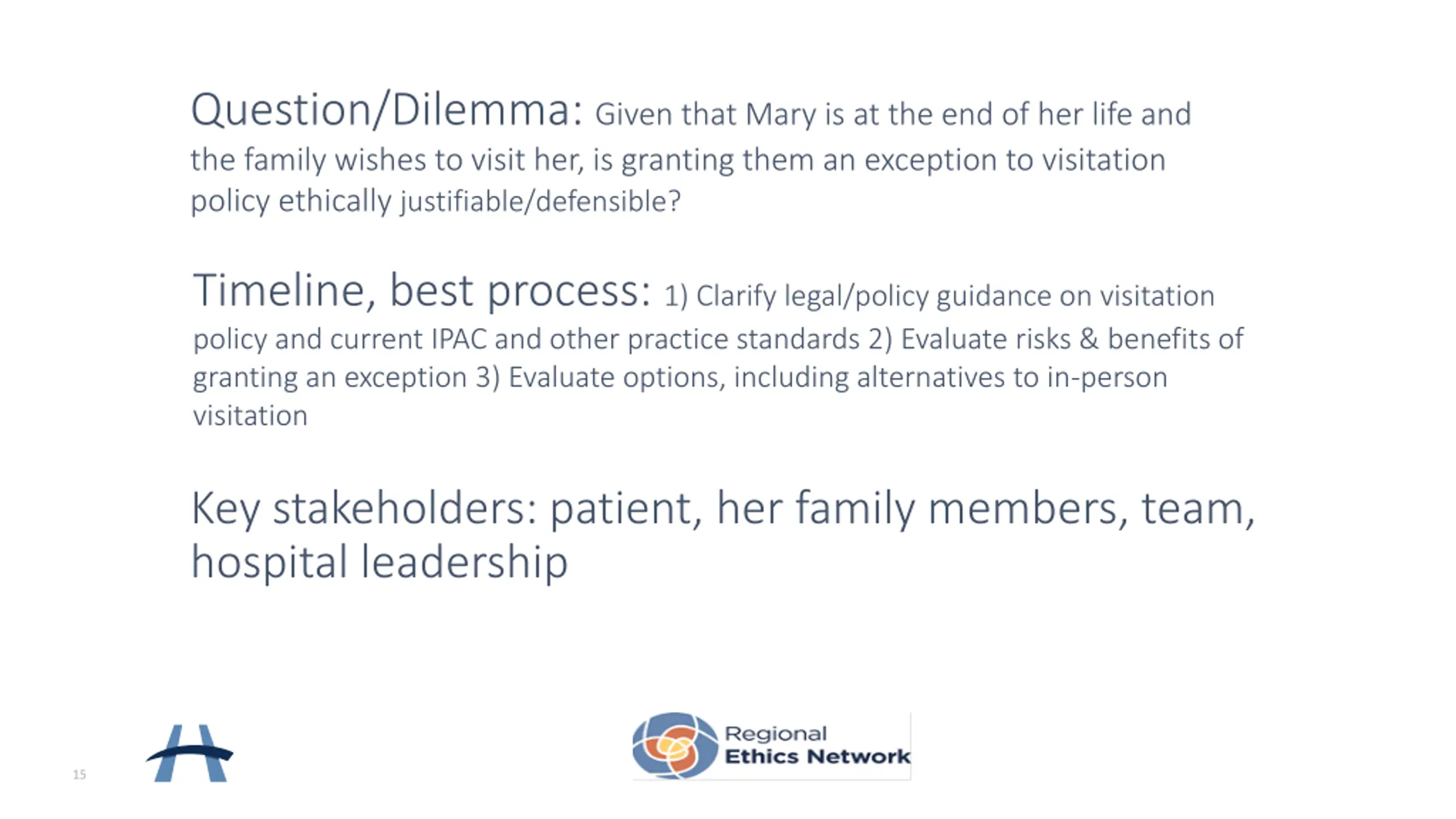 Question/Dilemma: Given that Mary is at the end of her life and the family wishes to visit her, is granting them an exception to visitation policy ethically justifiable/defensible? Timeline, best process: 1) Clarify legal/policy guidance on visitation policy and current IPAC and other practice standards 2) Evaluate risks & benefits of granting an exception 3) Evaluate options, including alternatives to in-person visitation Key stakeholders: patient, her family members, team, hospital leadership 15