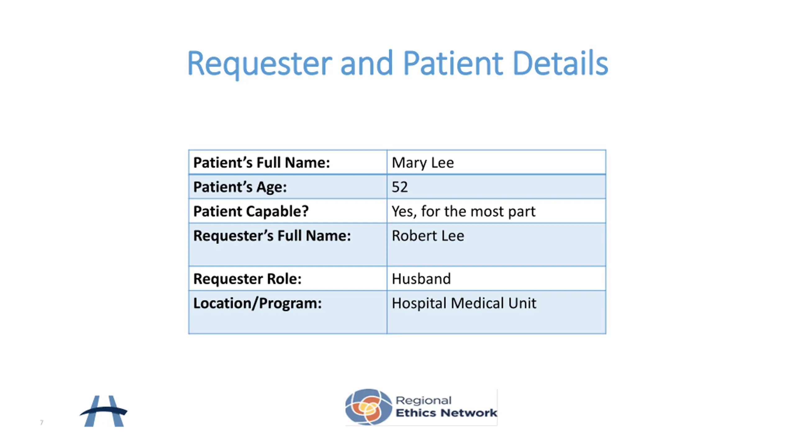 Requester and Patient Details Requester and Patient Details Patient s Full Name: Patient s Age: Patient Capable? Requester s Full Name: Mary Lee 52 Yes, for the most part Robert Lee Requester Role: Location/Program: Husband Hospital Medical Unit 7