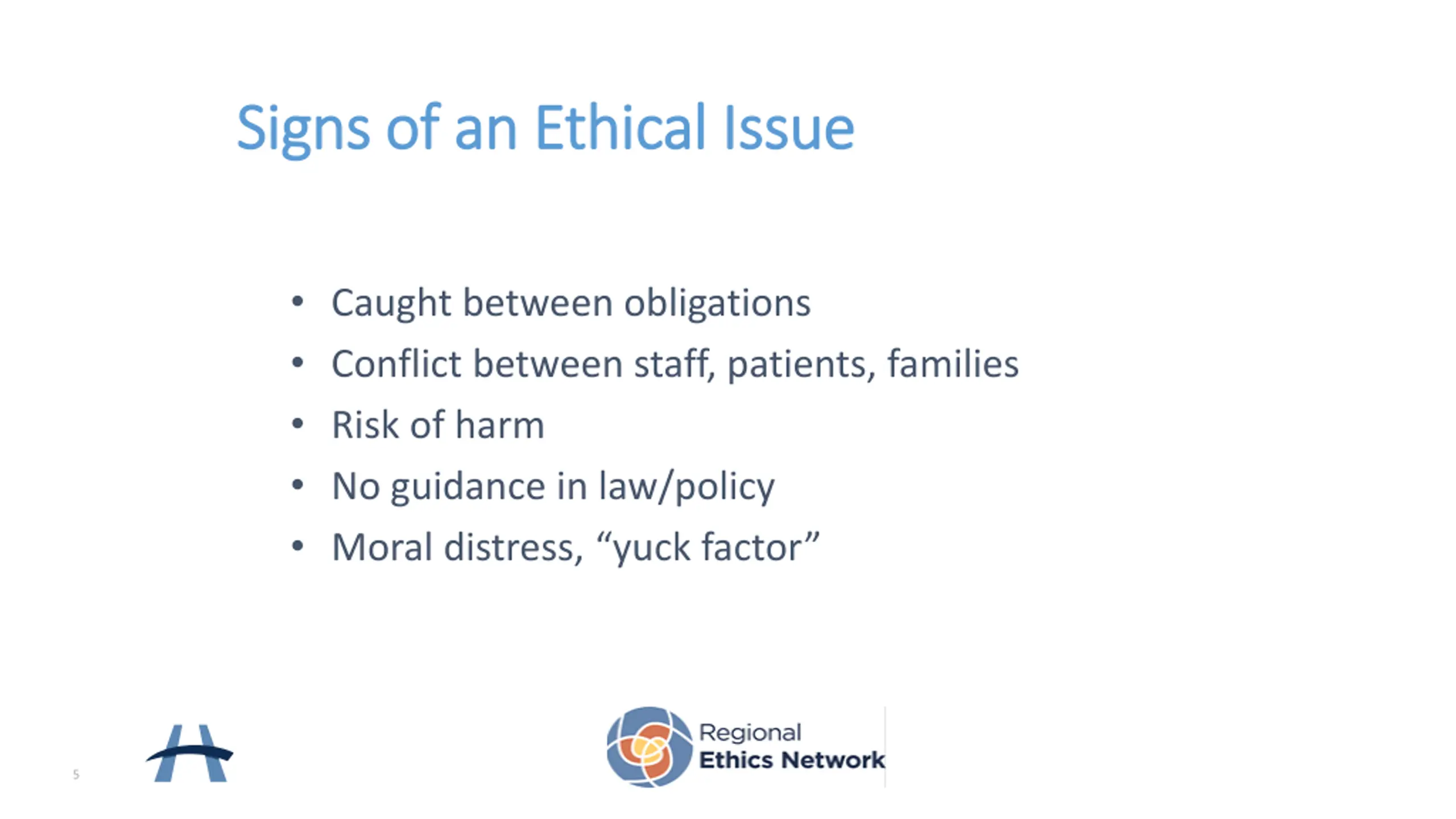 Signs of an Ethical Issue Signs of an Ethical Issue Caught between obligations Conflict between staff, patients, families Risk of harm No guidance in law/policy Moral distress, yuck factor 5