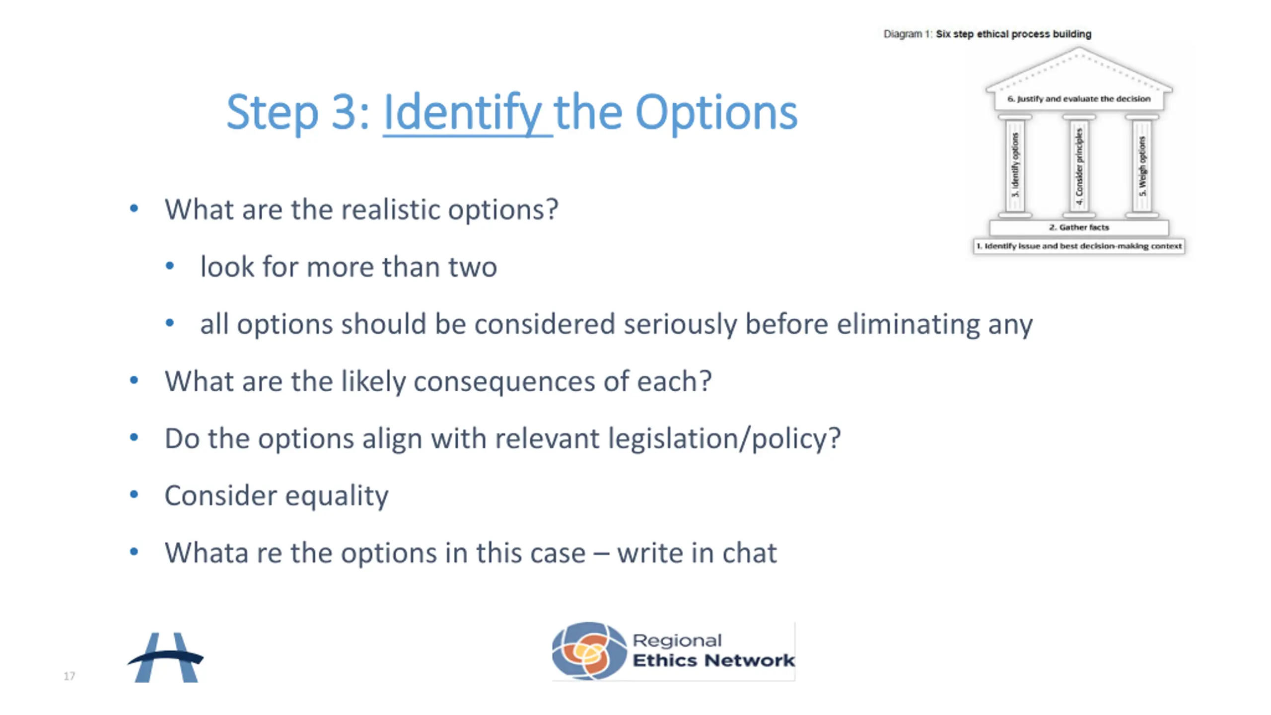 Step 3: Step 3: Identify Identify the Options the Options What are the realistic options? look for more than two all options should be considered seriously before eliminating any What are the likely consequences of each? Do the options align with relevant legislation/policy? Consider equality Whata re the options in this case write in chat 17