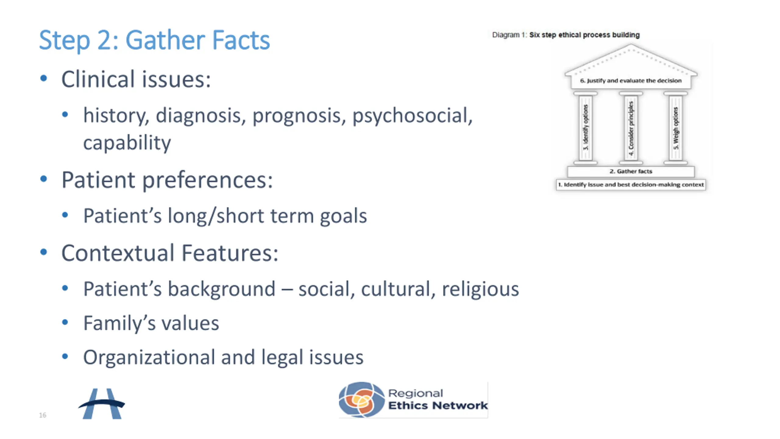 Step Step 2: Gather Facts 2: Gather Facts Clinical issues: history, diagnosis, prognosis, psychosocial, capability Patient preferences: Patient s long/short term goals Contextual Features: Patient s background social, cultural, religious Family s values Organizational and legal issues 16