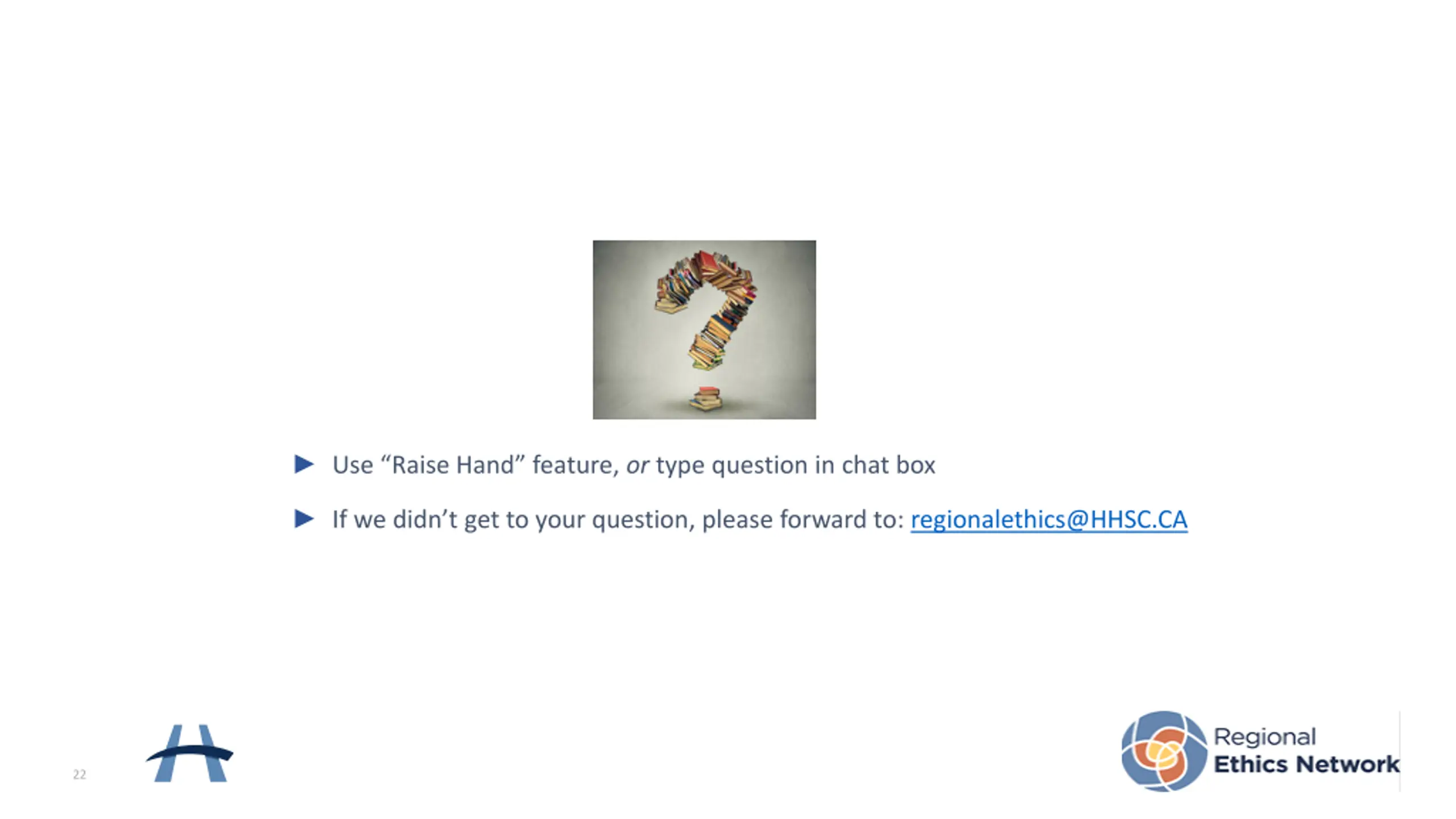 Use Raise Hand feature, or type question in chat box If we didn t get to your question, please forward to: regionalethics@HHSC.CA 22