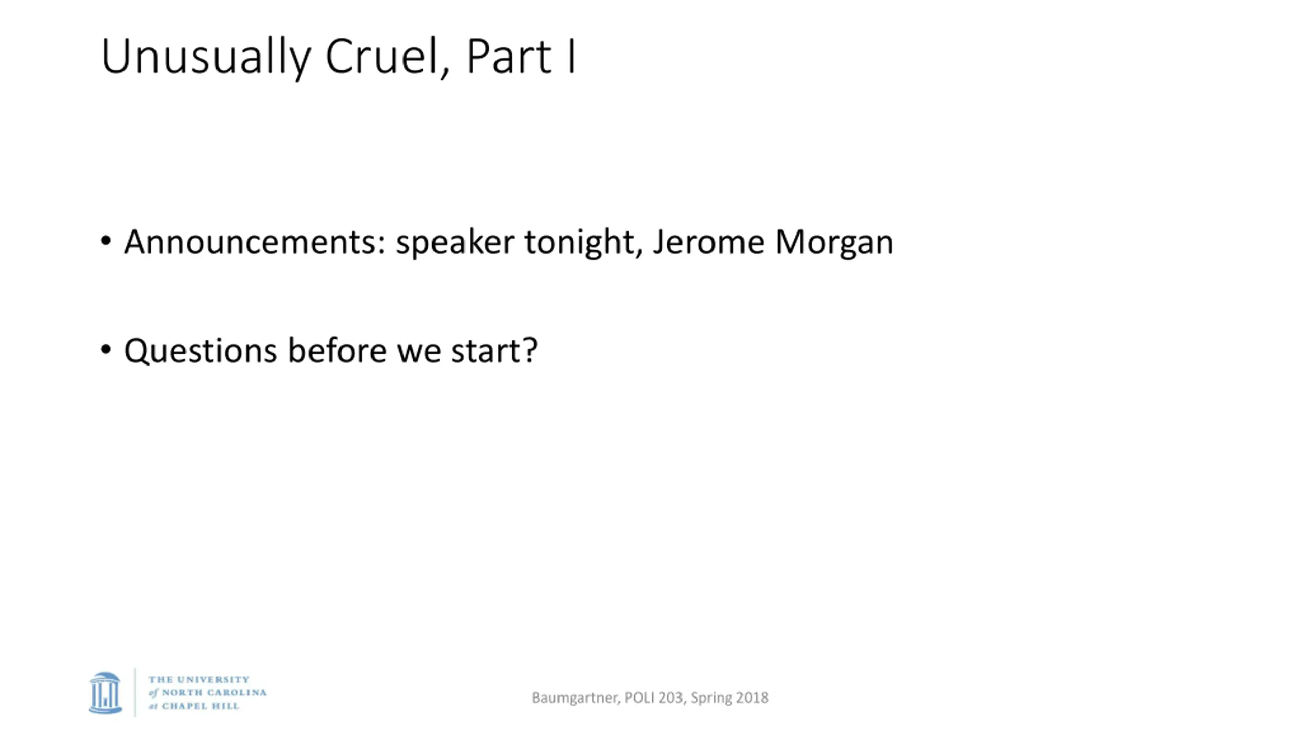 Unusually Cruel, Part I Announcements: speaker tonight, Jerome Morgan Questions before we start? Baumgartner, POLI 203, Spring 2018