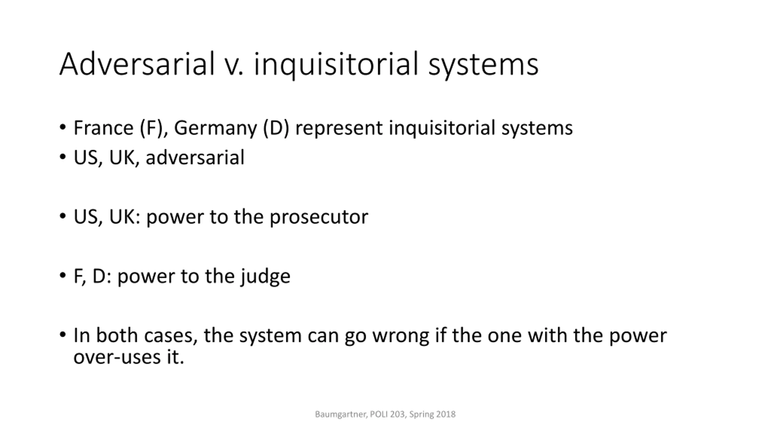 Adversarial v. inquisitorial systems France (F), Germany (D) represent inquisitorial systems US, UK, adversarial US, UK: power to the prosecutor F, D: power to the judge In both cases, the system can go wrong if the one with the power over-uses it. Baumgartner, POLI 203, Spring 2018