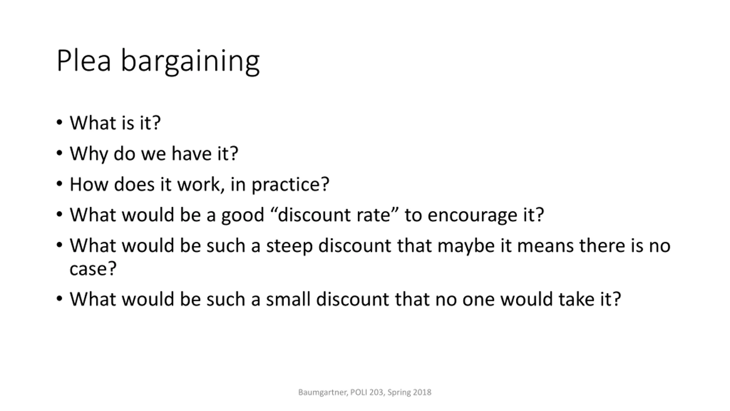 Plea bargaining What is it? Why do we have it? How does it work, in practice? What would be a good discount rate to encourage it? What would be such a steep discount that maybe it means there is no case? What would be such a small discount that no one would take it? Baumgartner, POLI 203, Spring 2018