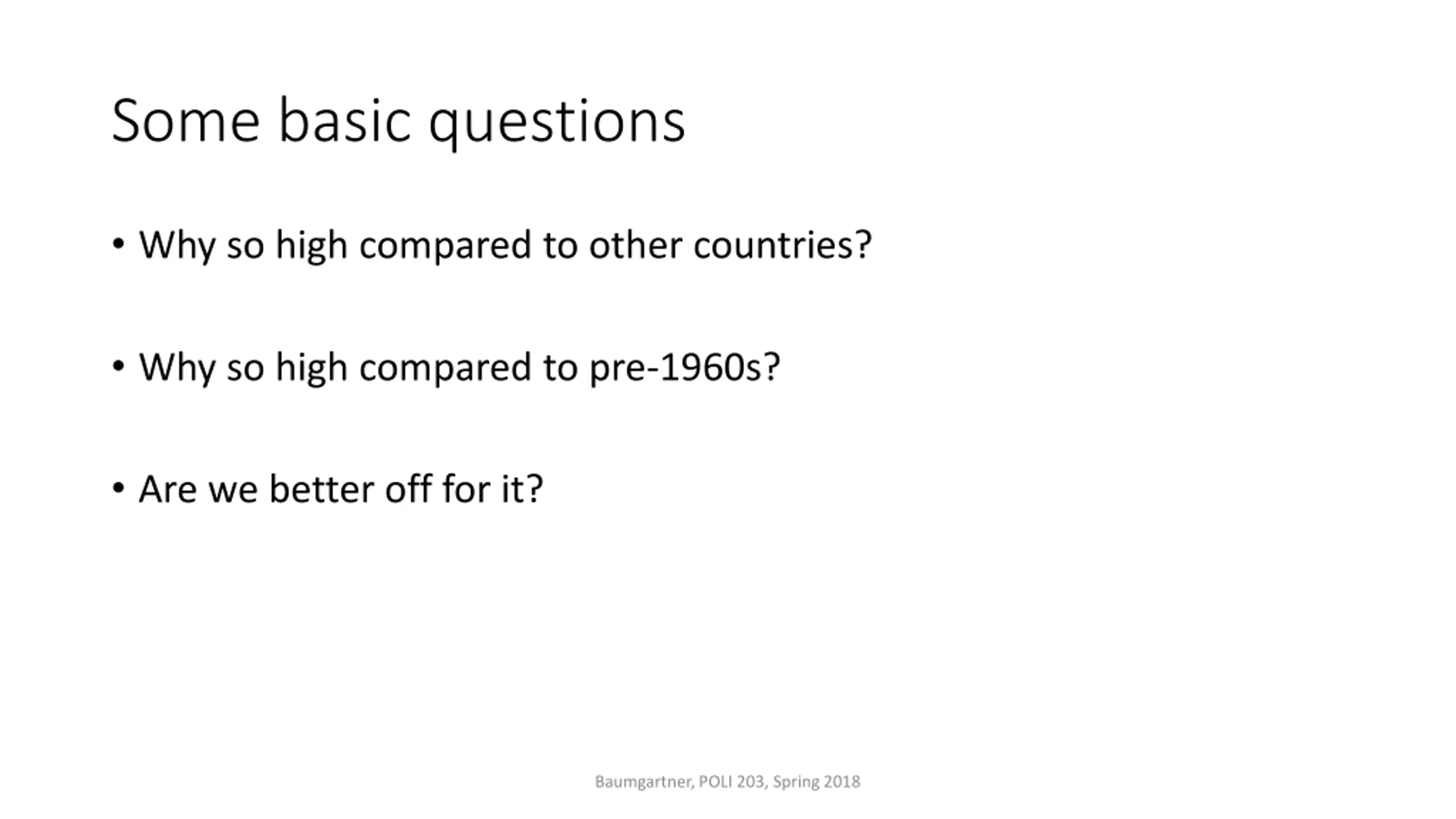Some basic questions Why so high compared to other countries? Why so high compared to pre-1960s? Are we better off for it? Baumgartner, POLI 203, Spring 2018