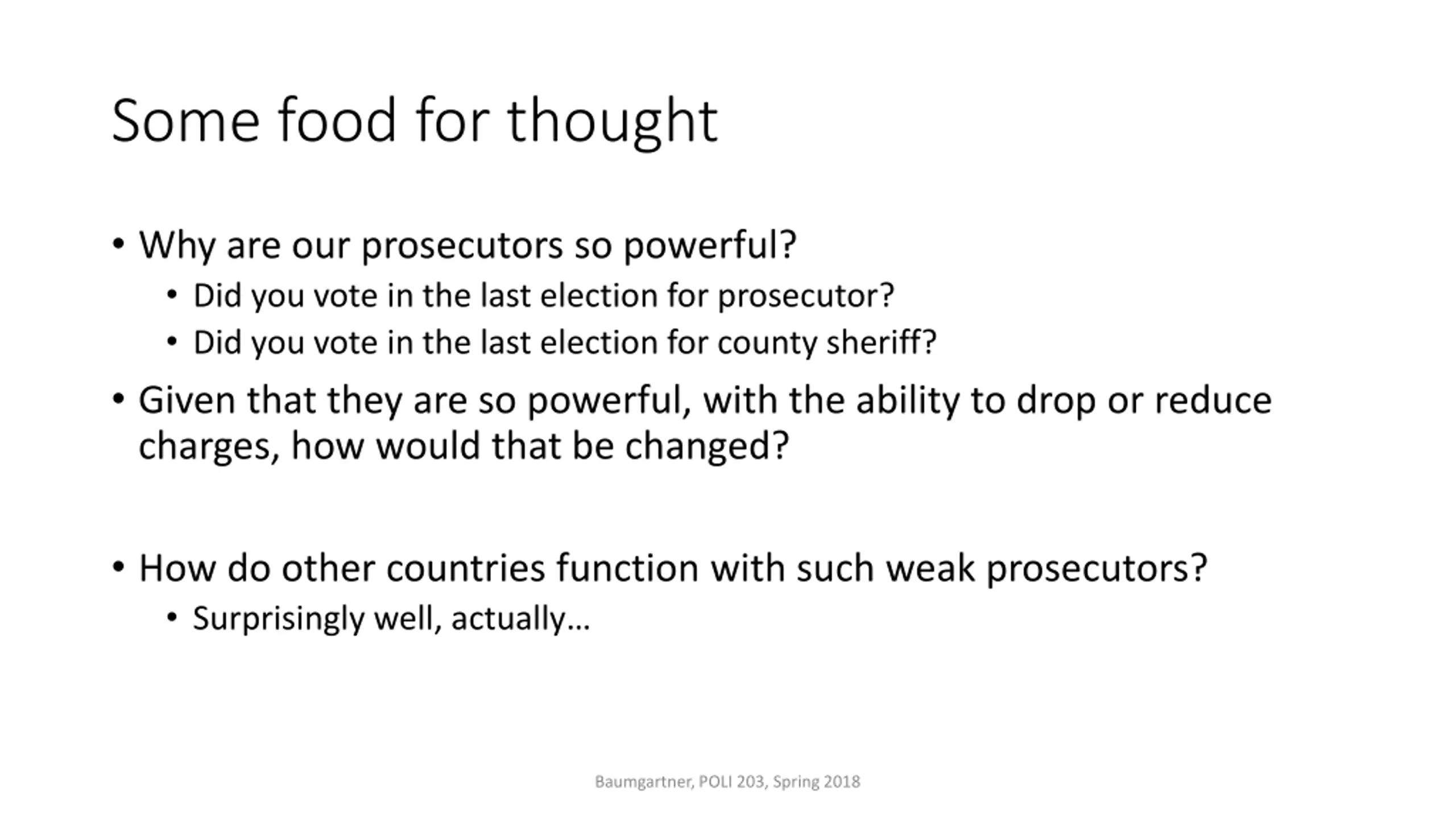 Some food for thought Why are our prosecutors so powerful? Did you vote in the last election for prosecutor? Did you vote in the last election for county sheriff? Given that they are so powerful, with the ability to drop or reduce charges, how would that be changed? How do other countries function with such weak prosecutors? Surprisingly well, actually Baumgartner, POLI 203, Spring 2018