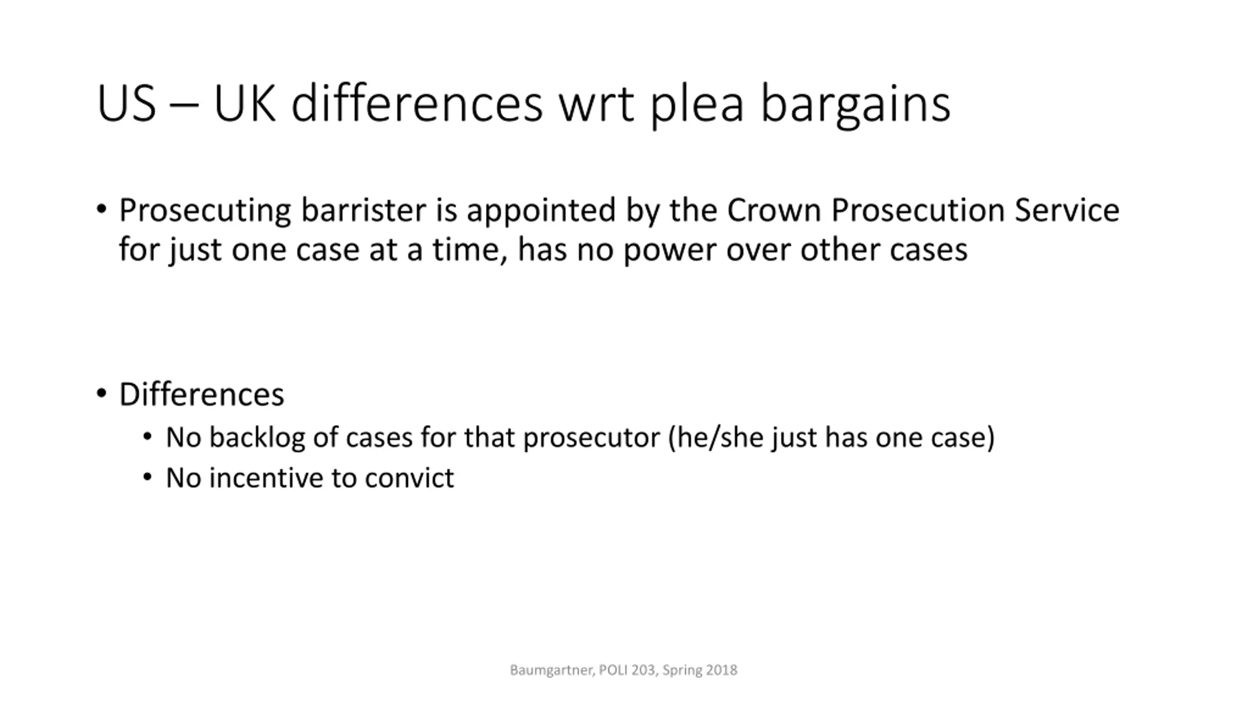 US UK differences wrt plea bargains Prosecuting barrister is appointed by the Crown Prosecution Service for just one case at a time, has no power over other cases Differences No backlog of cases for that prosecutor (he/she just has one case) No incentive to convict Baumgartner, POLI 203, Spring 2018