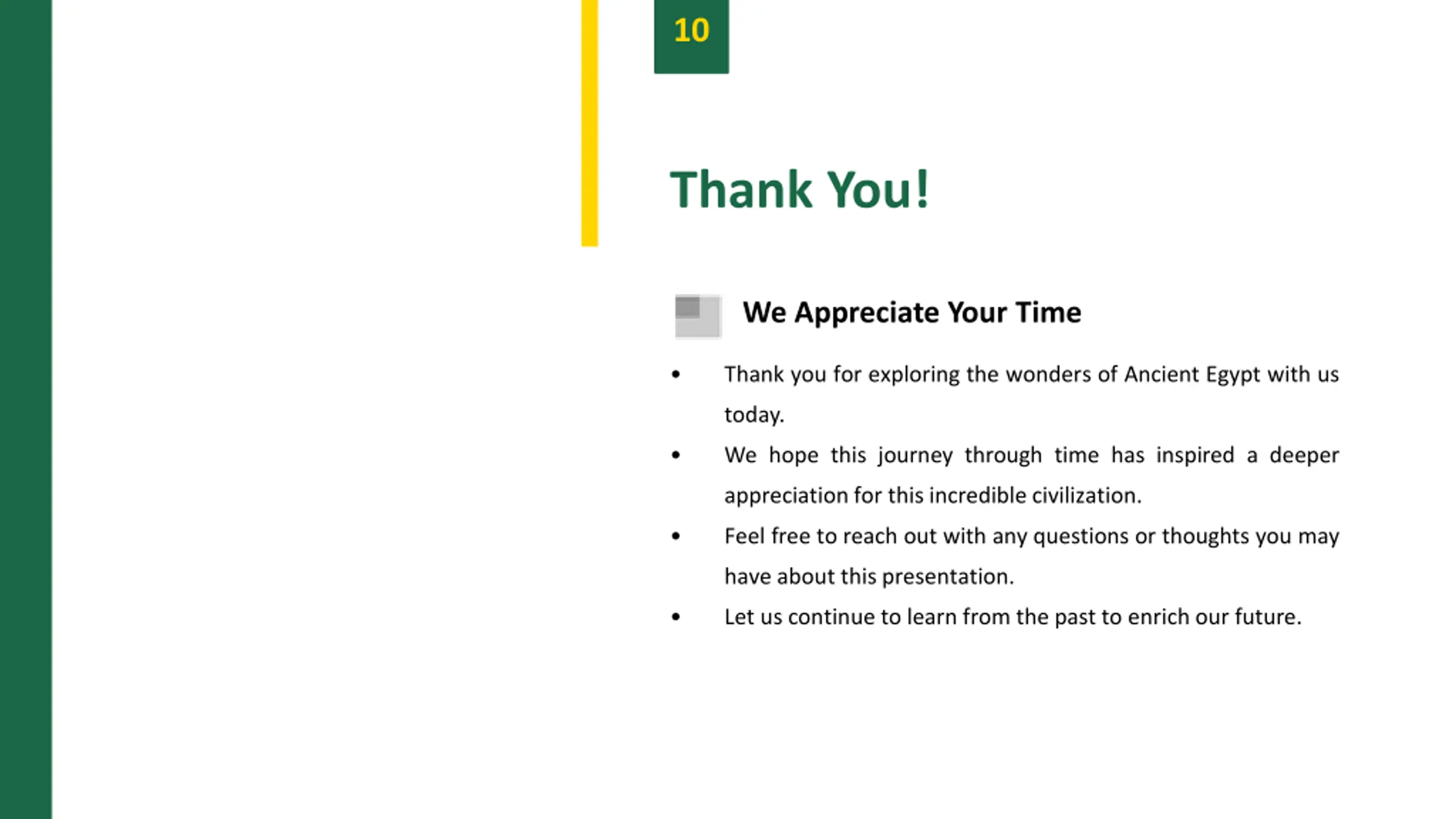 10 Thank You! We Appreciate Your Time Thank you for exploring the wonders of Ancient Egypt with us today. We hope this journey through time has inspired a deeper appreciationfor this incredible civilization. Feel free to reach out with any questions or thoughts you may have about this presentation. Let us continue to learn from the past to enrich our future. Photo by Pexels