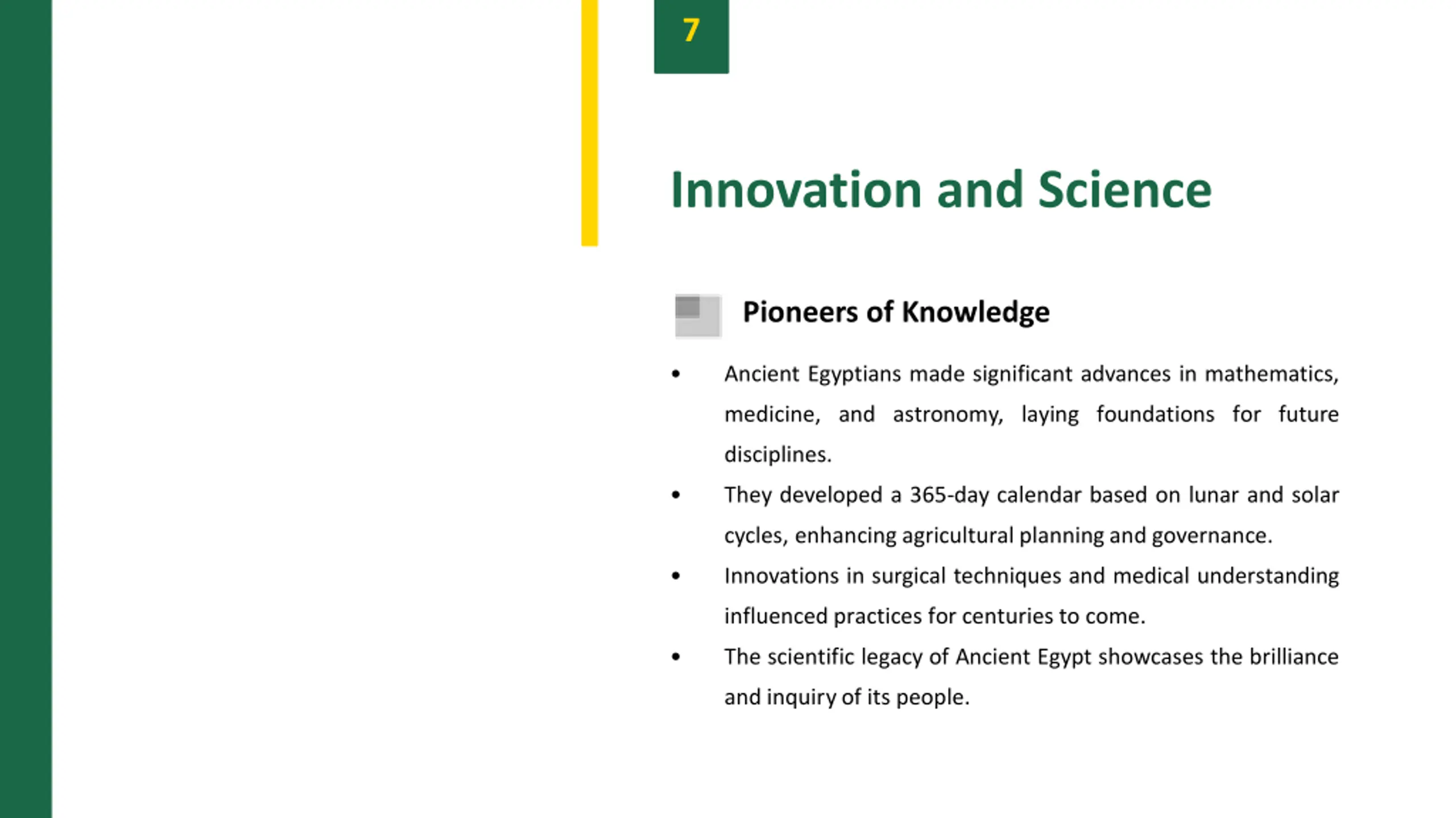 7 Innovation and Science Pioneers of Knowledge Ancient Egyptians made significant advances in mathematics, medicine, and astronomy, laying foundations for future disciplines. They developed a 365-day calendar based on lunar and solar cycles, enhancing agricultural planning and governance. Innovations in surgical techniques and medical understanding influenced practices for centuries to come. The scientific legacy of Ancient Egypt showcases the brilliance and inquiryof its people. Photo by Pexels