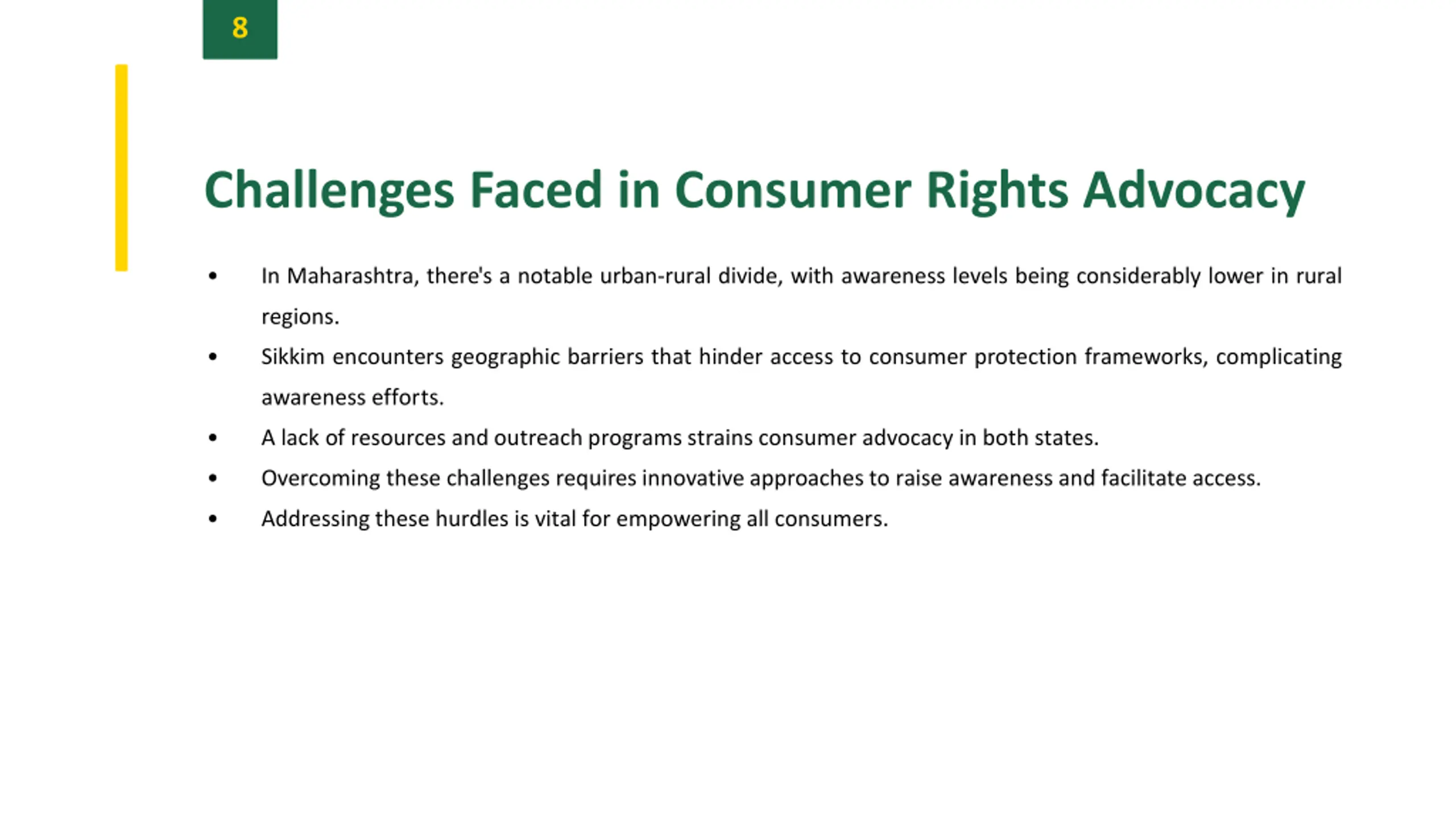 8 Challenges Faced in Consumer Rights Advocacy In Maharashtra, there's a notable urban-rural divide, with awareness levels being considerably lower in rural regions. Sikkim encounters geographic barriers that hinder access to consumer protection frameworks, complicating awareness efforts. A lack of resources and outreach programs strains consumer advocacy in both states. Overcoming these challenges requires innovative approaches to raise awareness and facilitate access. Addressing these hurdles is vital for empowering all consumers.