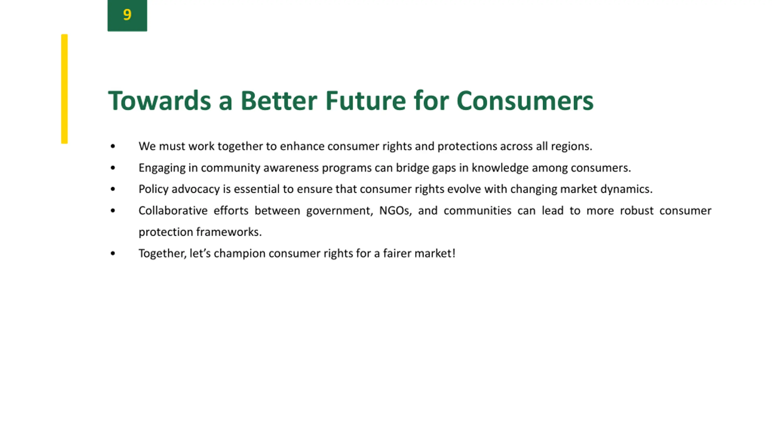 9 Towards a Better Future for Consumers We must work together to enhance consumer rights and protections across all regions. Engaging in community awareness programs can bridge gaps in knowledge among consumers. Policy advocacy is essential to ensure that consumer rights evolve with changing market dynamics. Collaborative efforts between government, NGOs, and communities can lead to more robust consumer protection frameworks. Together, let s champion consumer rights for a fairer market!