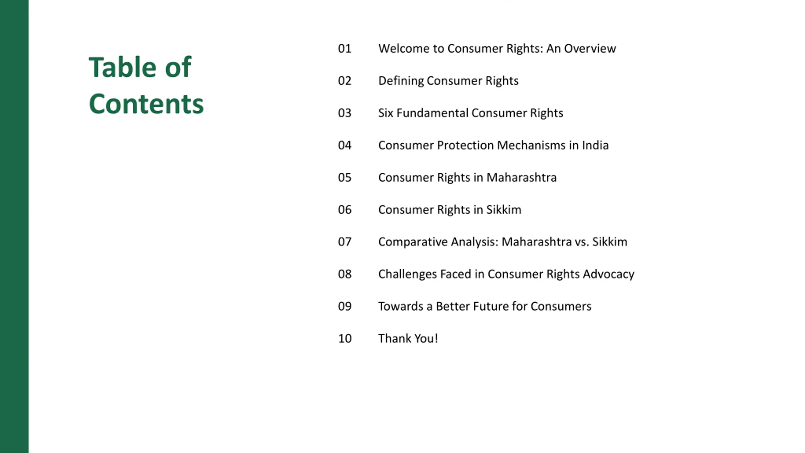 01 Welcome to Consumer Rights: An Overview Table of Contents 02 Defining Consumer Rights 03 Six Fundamental Consumer Rights 04 Consumer Protection Mechanisms in India 05 Consumer Rights in Maharashtra 06 Consumer Rights in Sikkim 07 Comparative Analysis: Maharashtra vs. Sikkim 08 Challenges Faced in Consumer Rights Advocacy 09 Towards a Better Future for Consumers 10 Thank You!