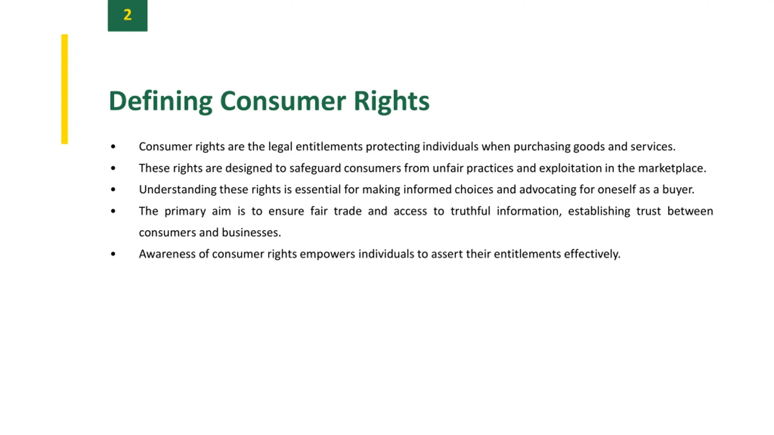 2 Defining Consumer Rights Consumer rights are the legal entitlements protectingindividuals when purchasing goods and services. These rights are designed to safeguardconsumers from unfairpractices and exploitation in the marketplace. Understanding these rights is essential for making informed choices and advocating for oneself as a buyer. The primary aim is to ensure fair trade and access to truthful information, establishing trust between consumers and businesses. Awareness of consumer rights empowers individuals to assert their entitlements effectively.