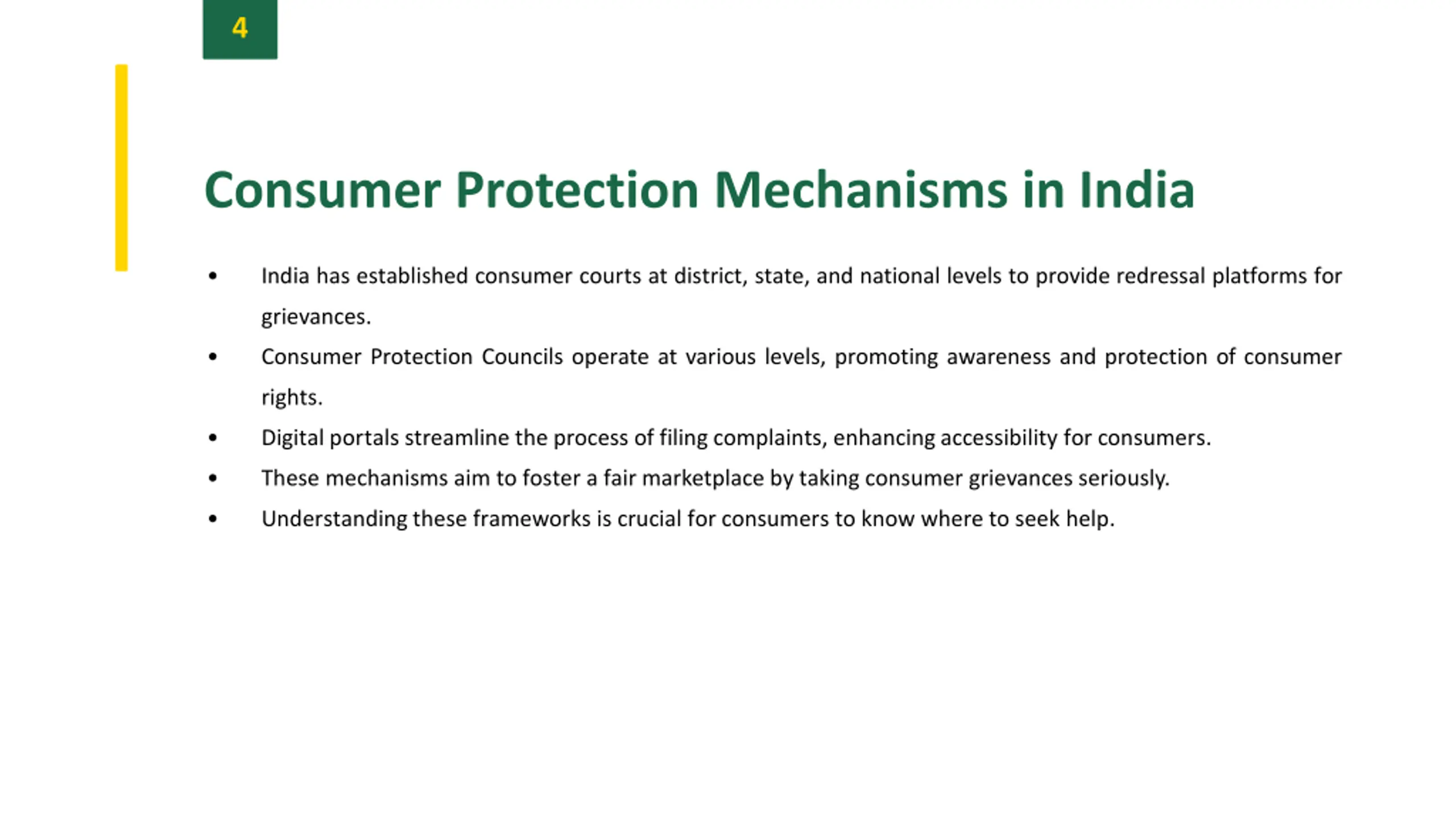 4 Consumer Protection Mechanisms in India India has established consumer courts at district, state, and national levels to provide redressal platforms for grievances. Consumer Protection Councils operate at various levels, promoting awareness and protection of consumer rights. Digital portals streamline the process of filing complaints, enhancingaccessibility for consumers. These mechanisms aim to foster a fair marketplace by taking consumer grievances seriously. Understanding these frameworks is crucial for consumers to know where to seek help.