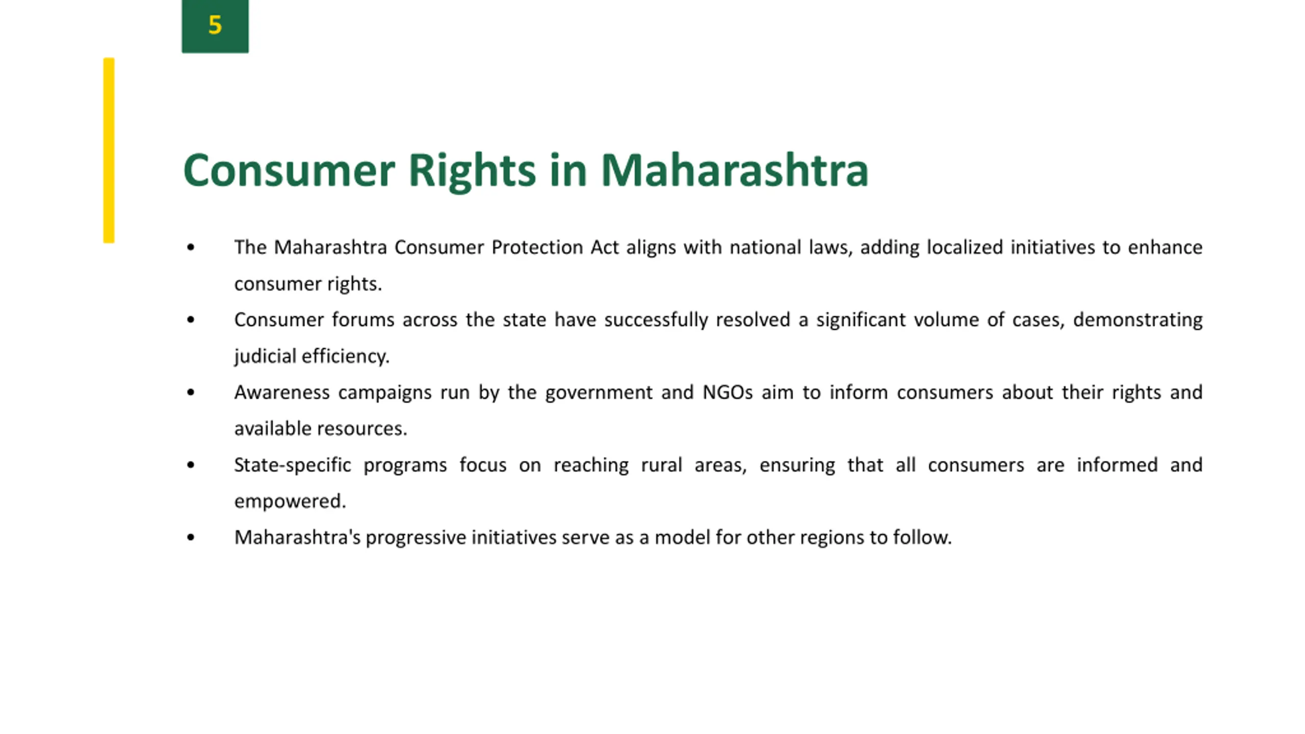 5 Consumer Rights in Maharashtra The Maharashtra Consumer Protection Act aligns with national laws, adding localized initiatives to enhance consumer rights. Consumer forums across the state have successfully resolved a significant volume of cases, demonstrating judicial efficiency. Awareness campaigns run by the government and NGOs aim to inform consumers about their rights and available resources. State-specific programs focus on reaching rural areas, ensuring that all consumers are informed and empowered. Maharashtra's progressive initiatives serve as a model for other regions to follow.
