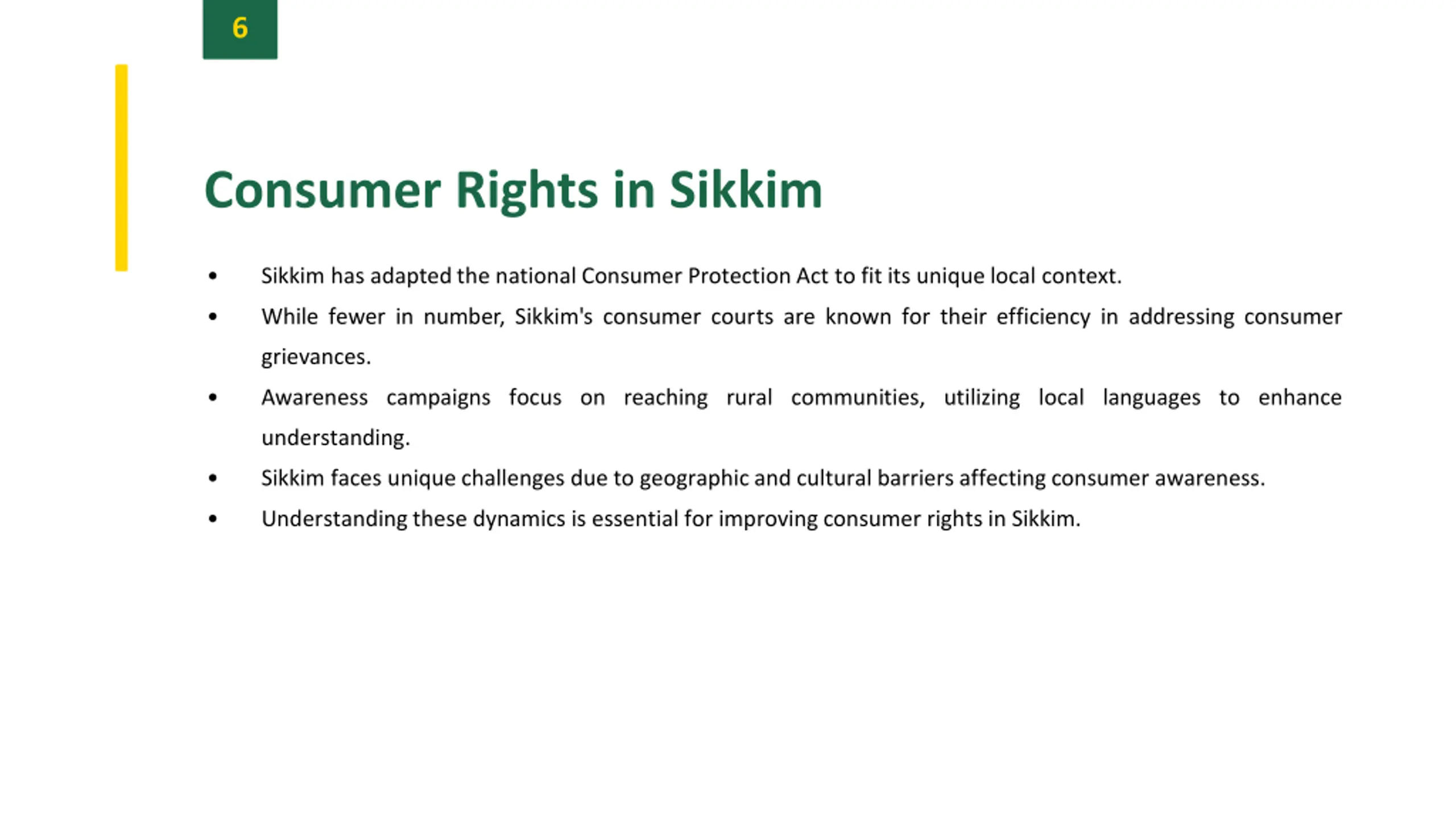 6 Consumer Rights in Sikkim Sikkim has adaptedthe national Consumer Protection Act to fit its unique local context. While fewer in number, Sikkim's consumer courts are known for their efficiency in addressing consumer grievances. Awareness campaigns focus on reaching rural communities, utilizing local languages to enhance understanding. Sikkim faces unique challenges due to geographic and cultural barriers affecting consumer awareness. Understanding these dynamics is essential for improving consumer rights in Sikkim.