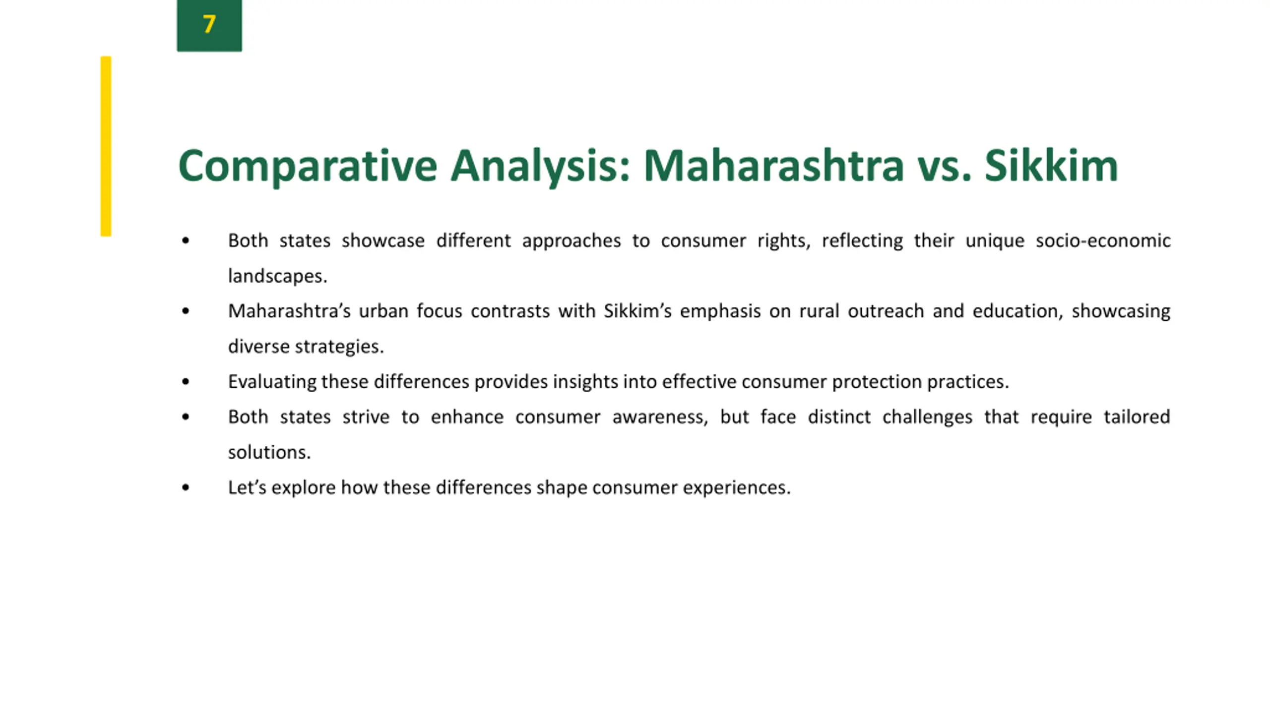 7 Comparative Analysis: Maharashtra vs. Sikkim Both states showcase different approaches to consumer rights, reflecting their unique socio-economic landscapes. Maharashtra s urban focus contrasts with Sikkim s emphasis on rural outreach and education, showcasing diverse strategies. Evaluating these differences provides insights into effective consumer protection practices. Both states strive to enhance consumer awareness, but face distinct challenges that require tailored solutions. Let s explore how these differences shape consumer experiences.