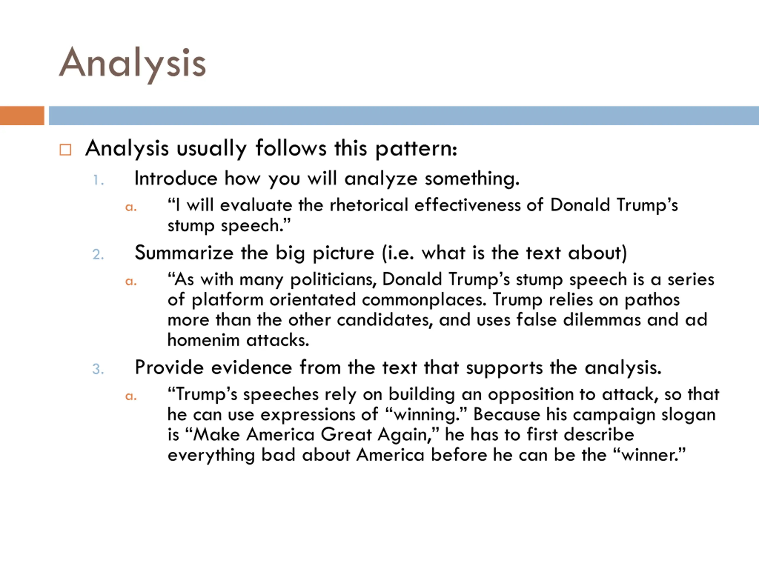 Analysis Analysis usually follows this pattern: Introduce how you will analyze something. a. I will evaluate the rhetorical effectiveness of Donald Trump s stump speech. Summarize the big picture (i.e. what is the text about) a. As with many politicians, Donald Trump s stump speech is a series of platform orientated commonplaces. Trump relies on pathos more than the other candidates, and uses false dilemmas and ad homenim attacks. Provide evidence from the text that supports the analysis. a. Trump s speeches rely on building an opposition to attack, so that he can use expressions of winning. Because his campaign slogan is Make America Great Again, he has to first describe everything bad about America before he can be the winner. 1. 2. 3.