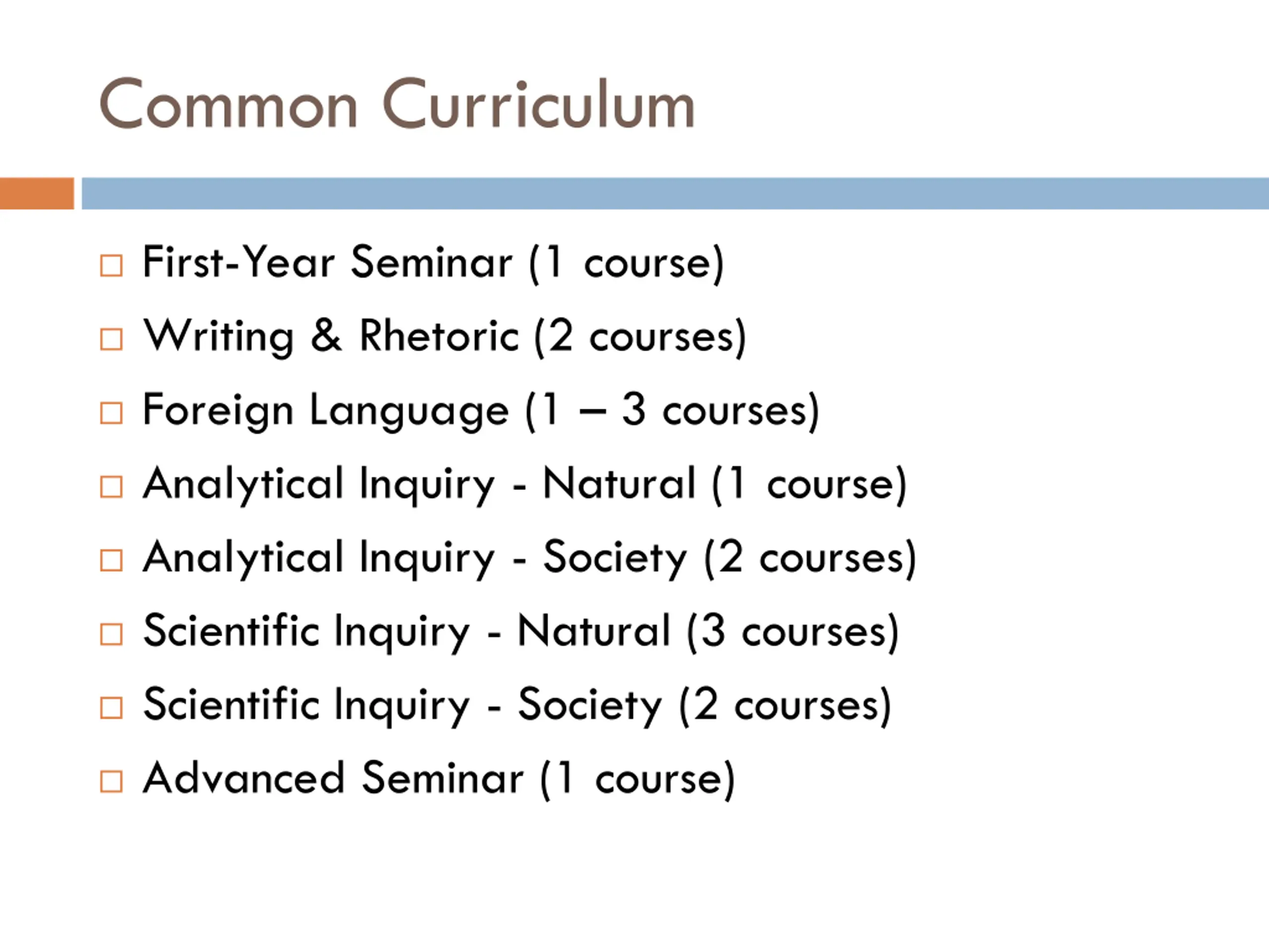 Common Curriculum First-Year Seminar (1 course) Writing & Rhetoric (2 courses) Foreign Language (1 3 courses) Analytical Inquiry - Natural (1 course) Analytical Inquiry - Society (2 courses) Scientific Inquiry - Natural (3 courses) Scientific Inquiry - Society (2 courses) Advanced Seminar (1 course)