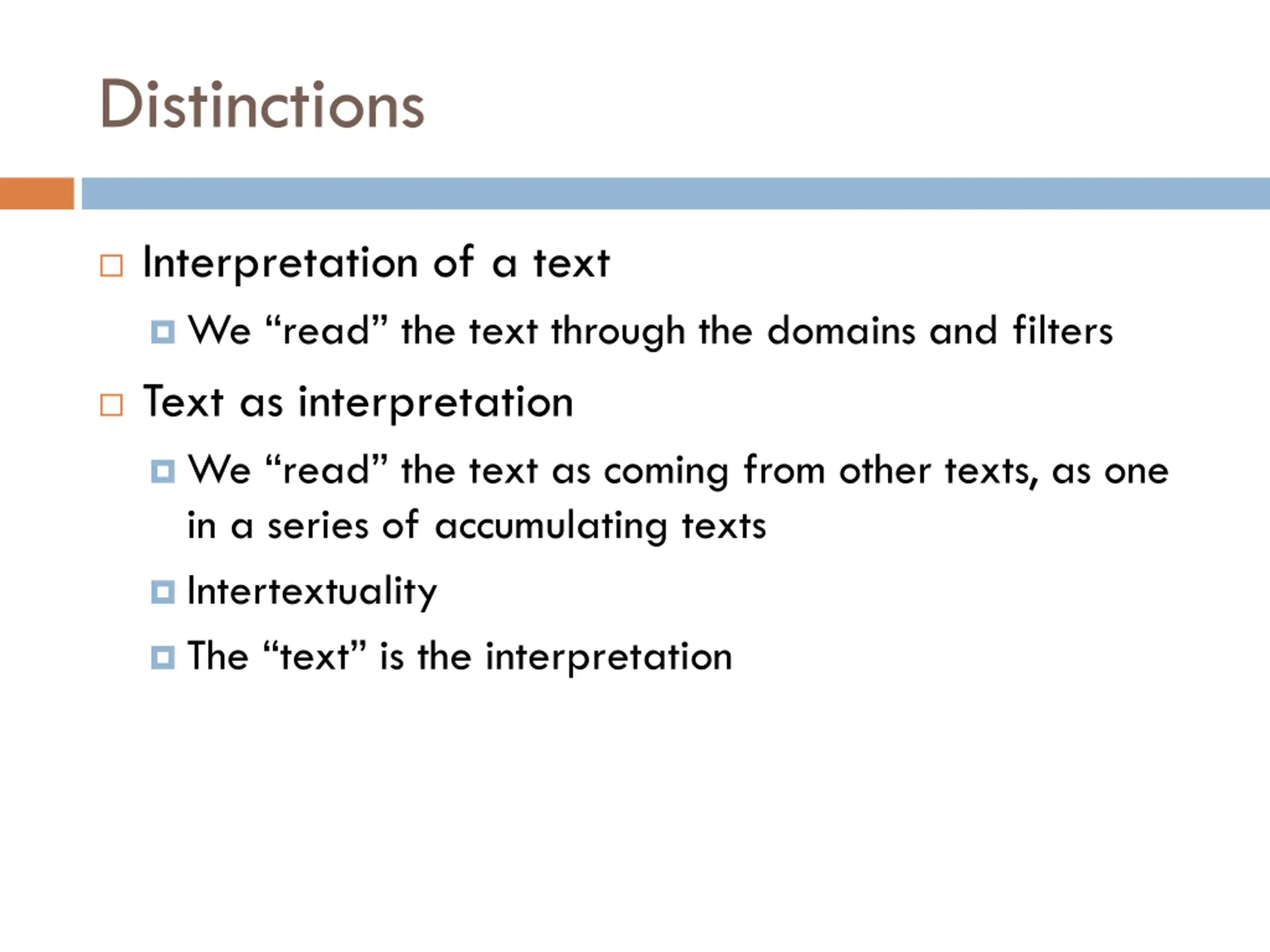 Distinctions Interpretation of a text We read the text through the domains and filters Text as interpretation We read the text as coming from other texts, as one in a series of accumulating texts Intertextuality The text is the interpretation
