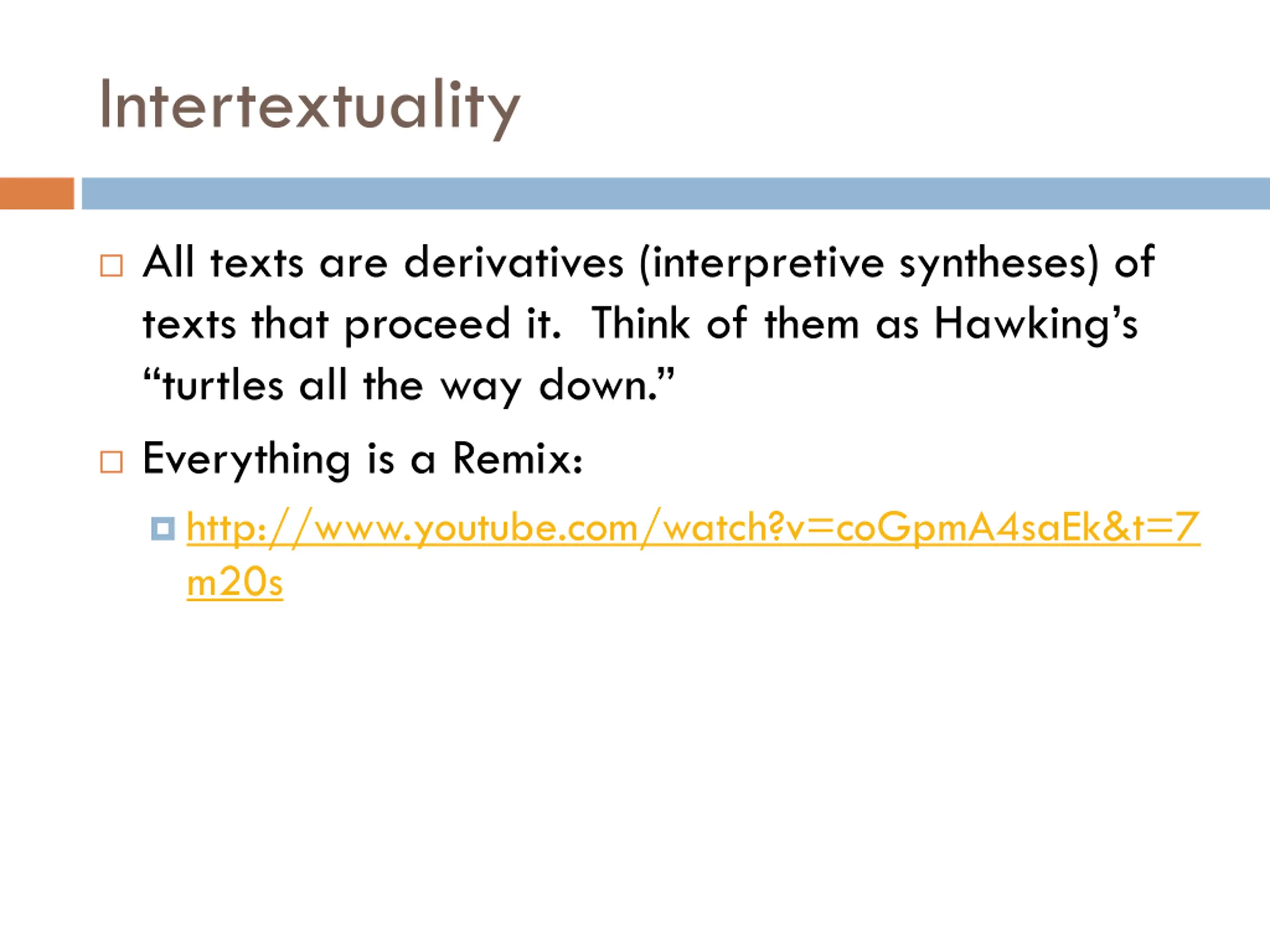 Intertextuality All texts are derivatives (interpretive syntheses) of texts that proceed it. Think of them as Hawking s turtles all the way down. Everything is a Remix: http://www.youtube.com/watch?v=coGpmA4saEk&t=7 m20s