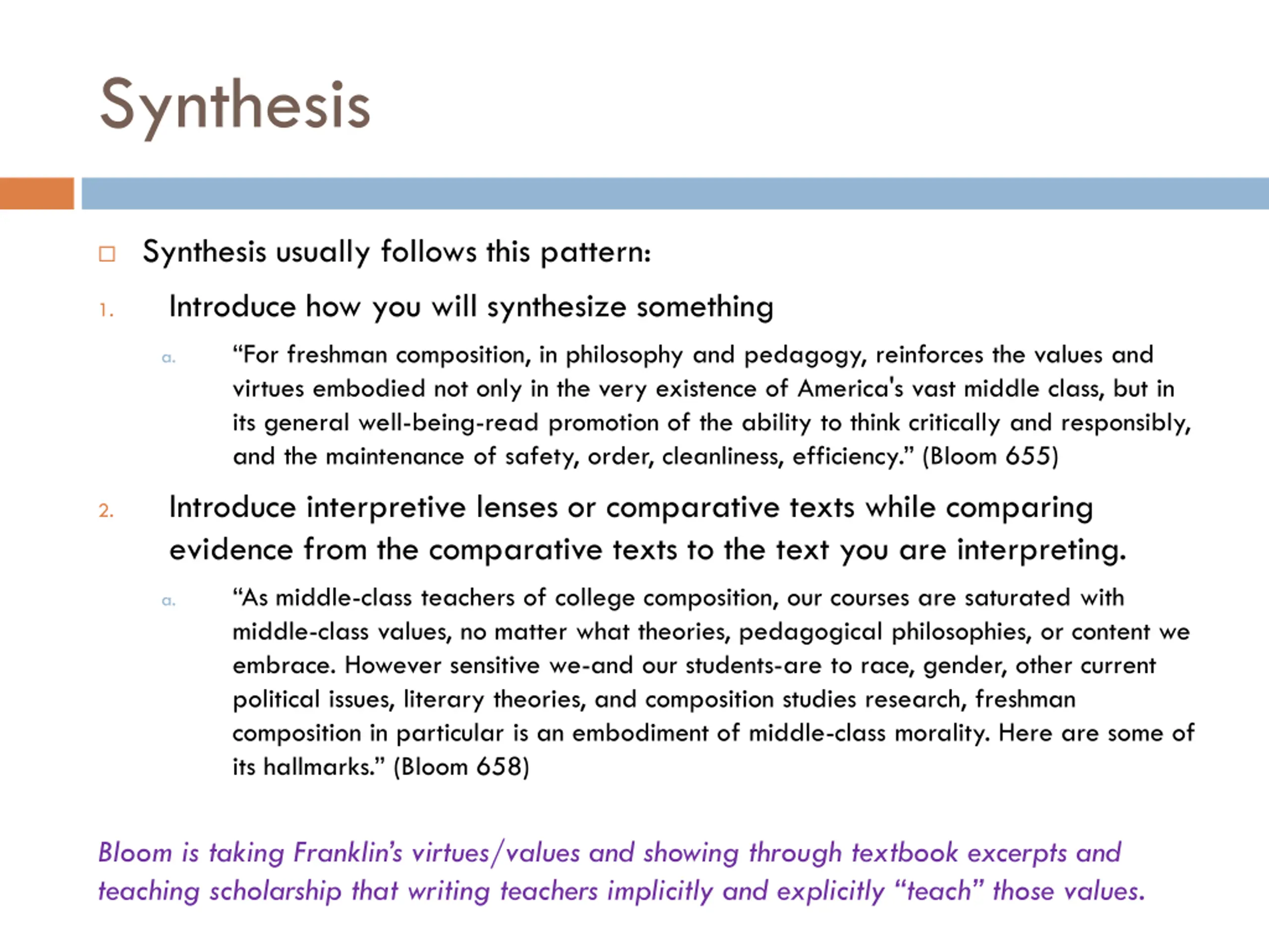 Synthesis Synthesis usually follows this pattern: Introduce how you will synthesize something For freshman composition, in philosophy and pedagogy, reinforces the values and virtues embodied not only in the very existence of America's vast middle class, but in its general well-being-read promotion of the ability to think critically and responsibly, and the maintenance of safety, order, cleanliness, efficiency. (Bloom 655) Introduce interpretive lenses or comparative texts while comparing evidence from the comparative texts to the text you are interpreting. As middle-class teachers of college composition, our courses are saturated with middle-class values, no matter what theories, pedagogical philosophies, or content we embrace. However sensitive we-and our students-are to race, gender, other current political issues, literary theories, and composition studies research, freshman composition in particular is an embodiment of middle-class morality. Here are some of its hallmarks. (Bloom 658) 1. a. 2. a. Bloom is taking Franklin s virtues/values and showing through textbook excerpts and teaching scholarship that writing teachers implicitly and explicitly teach those values.
