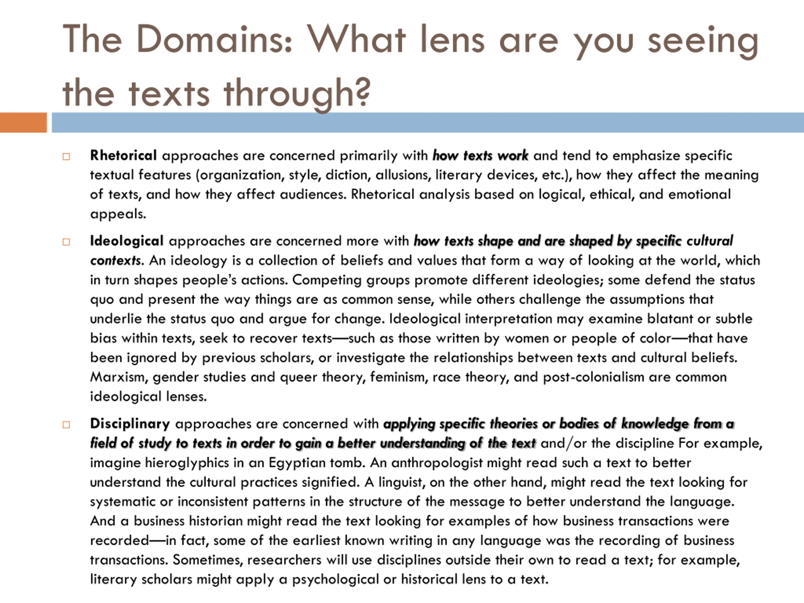 The Domains: What lens are you seeing the texts through? Rhetorical approaches are concerned primarily with how texts work and tend to emphasize specific textual features (organization, style, diction, allusions, literary devices, etc.), how they affect the meaning of texts, and how they affect audiences. Rhetorical analysis based on logical, ethical, and emotional appeals. Ideological approaches are concerned more with how texts shape and are shaped by specific cultural contexts. An ideology is a collection of beliefs and values that form a way of looking at the world, which in turn shapes people s actions. Competing groups promote different ideologies; some defend the status quo and present the way things are as common sense, while others challenge the assumptions that underlie the status quo and argue for change. Ideological interpretation may examine blatant or subtle bias within texts, seek to recover texts such as those written by women or people of color that have been ignored by previous scholars, or investigate the relationships between texts and cultural beliefs. Marxism, gender studies and queer theory, feminism, race theory, and post-colonialism are common ideological lenses. Disciplinary approaches are concerned with applying specific theories or bodies of knowledge from a field of study to texts in order to gain a better understanding of the text and/or the discipline For example, imagine hieroglyphics in an Egyptian tomb. An anthropologist might read such a text to better understand the cultural practices signified. A linguist, on the other hand, might read the text looking for systematic or inconsistent patterns in the structure of the message to better understand the language. And a business historian might read the text looking for examples of how business transactions were recorded in fact, some of the earliest known writing in any language was the recording of business transactions. Sometimes, researchers will use disciplines outside their own to read a text; for example, literary scholars might apply a psychological or historical lens to a text.