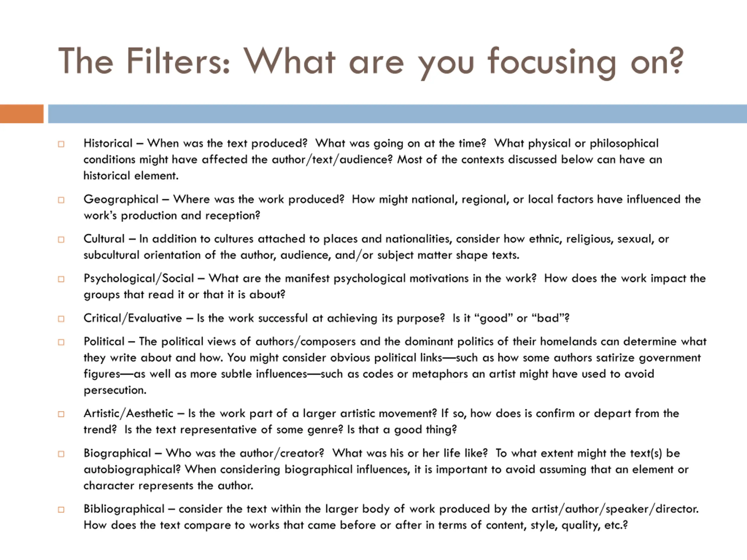 The Filters: What are you focusing on? Historical When was the text produced? What was going on at the time? What physical or philosophical conditions might have affected the author/text/audience? Most of the contexts discussed below can have an historical element. Geographical Where was the work produced? How might national, regional, or local factors have influenced the work s production and reception? Cultural In addition to cultures attached to places and nationalities, consider how ethnic, religious, sexual, or subcultural orientation of the author, audience, and/or subject matter shape texts. Psychological/Social What are the manifest psychological motivations in the work? How does the work impact the groups that read it or that it is about? Critical/Evaluative Is the work successful at achieving its purpose? Is it good or bad ? Political The political views of authors/composers and the dominant politics of their homelands can determine what they write about and how. You might consider obvious political links such as how some authors satirize government figures as well as more subtle influences such as codes or metaphors an artist might have used to avoid persecution. Artistic/Aesthetic Is the work part of a larger artistic movement? If so, how does is confirm or depart from the trend? Is the text representative of some genre? Is that a good thing? Biographical Who was the author/creator? What was his or her life like? To what extent might the text(s) be autobiographical? When considering biographical influences, it is important to avoid assuming that an element or character represents the author. Bibliographical consider the text within the larger body of work produced by the artist/author/speaker/director. How does the text compare to works that came before or after in terms of content, style, quality, etc.?