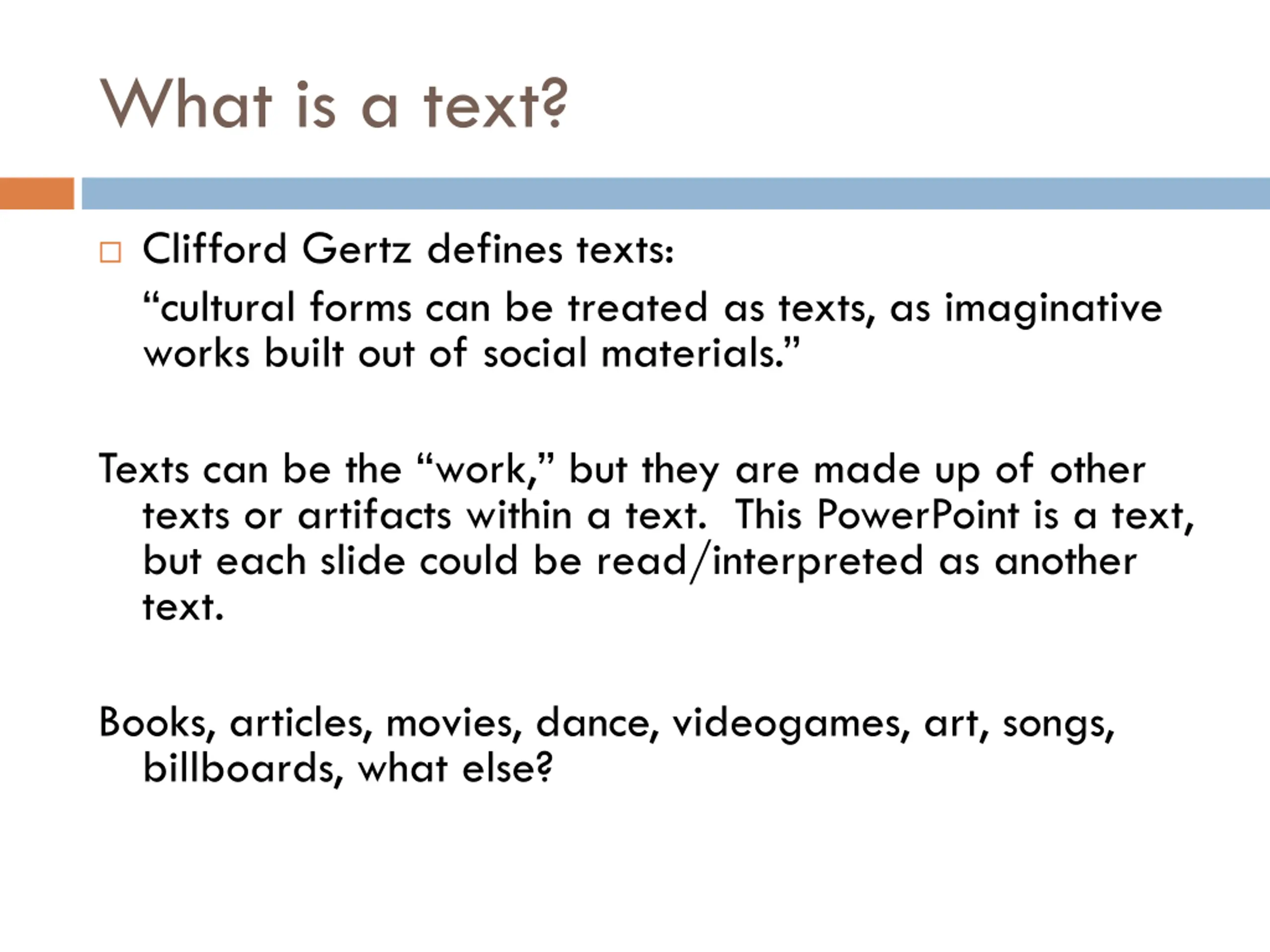 What is a text? Clifford Gertz defines texts: cultural forms can be treated as texts, as imaginative works built out of social materials. Texts can be the work, but they are made up of other texts or artifacts within a text. This PowerPoint is a text, but each slide could be read/interpreted as another text. Books, articles, movies, dance, videogames, art, songs, billboards, what else?