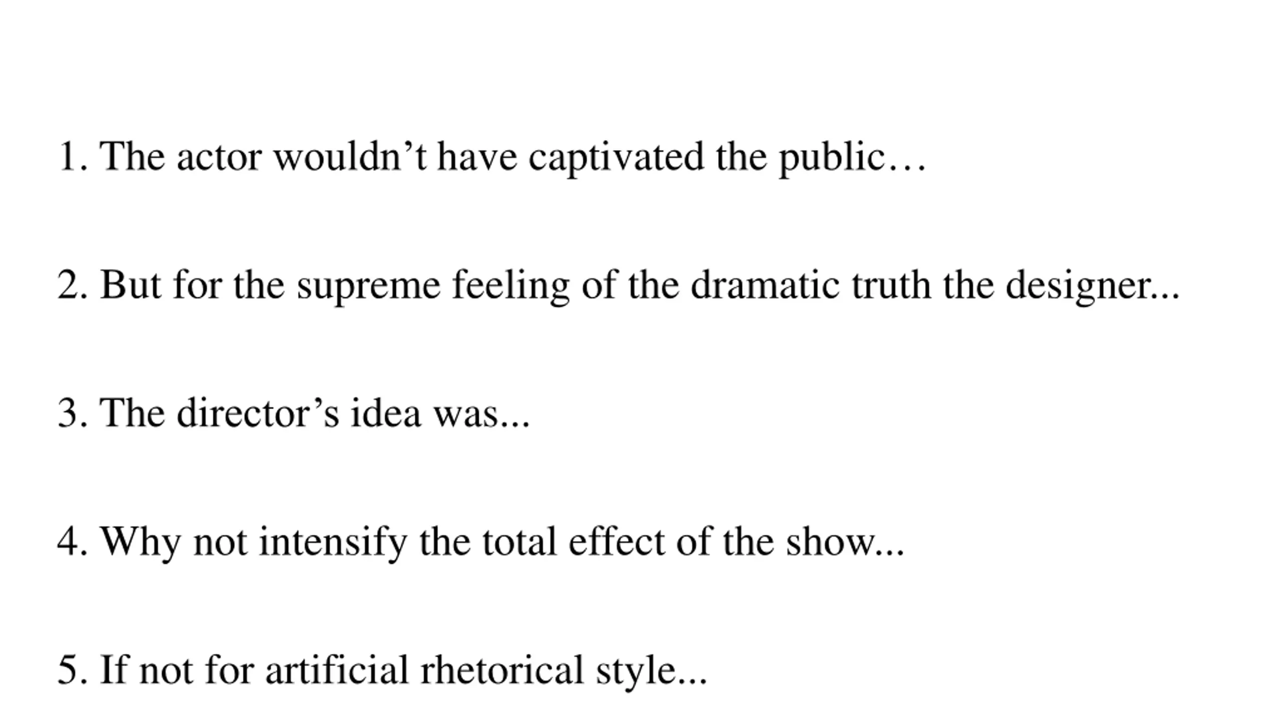 1. The actor wouldnt have captivated the public 2. But for the supreme feeling of the dramatic truth the designer... 3. The director s idea was... 4. Why not intensify the total effect of the show... 5. If not for artificial rhetorical style...
