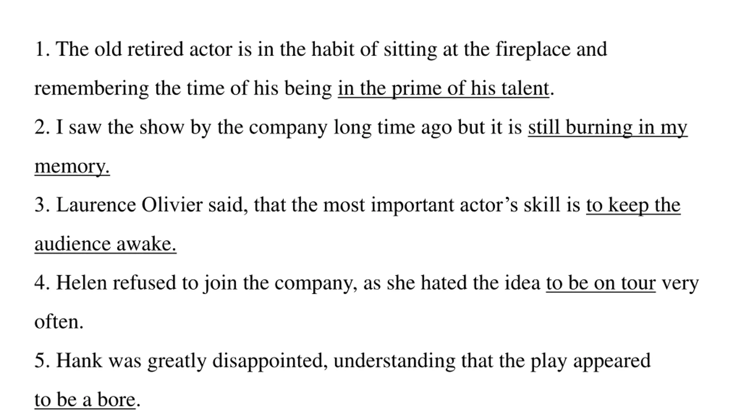1. The old retired actor is in the habit of sitting at the fireplace and remembering the time of his being in the prime of his talent. 2. I saw the show by the company long time ago but it is still burning in my memory. 3. Laurence Olivier said, that the most important actor s skill is to keep the audience awake. 4. Helen refused to join the company, as she hated the idea to be on tour very often. 5. Hank was greatly disappointed, understanding that the play appeared to be a bore.