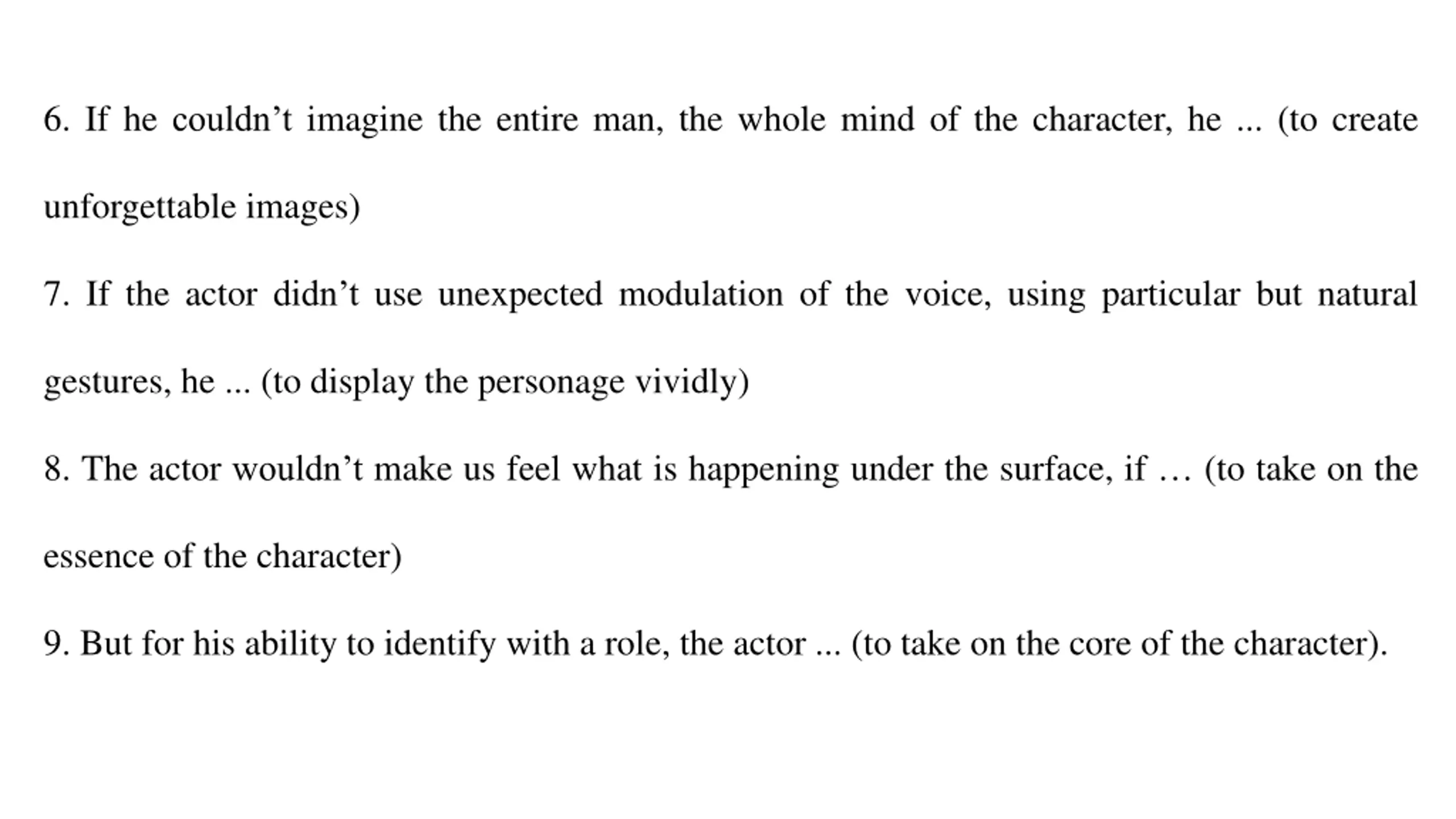 6. If he couldnt imagine the entire man, the whole mind of the character, he ... (to create unforgettable images) 7. If the actor didn t use unexpected modulation of the voice, using particular but natural gestures, he ... (to display the personage vividly) 8. The actor wouldn t make us feel what is happening under the surface, if (to take on the essence of the character) 9. But for his ability to identify with a role, the actor ... (to take on the core of the character).