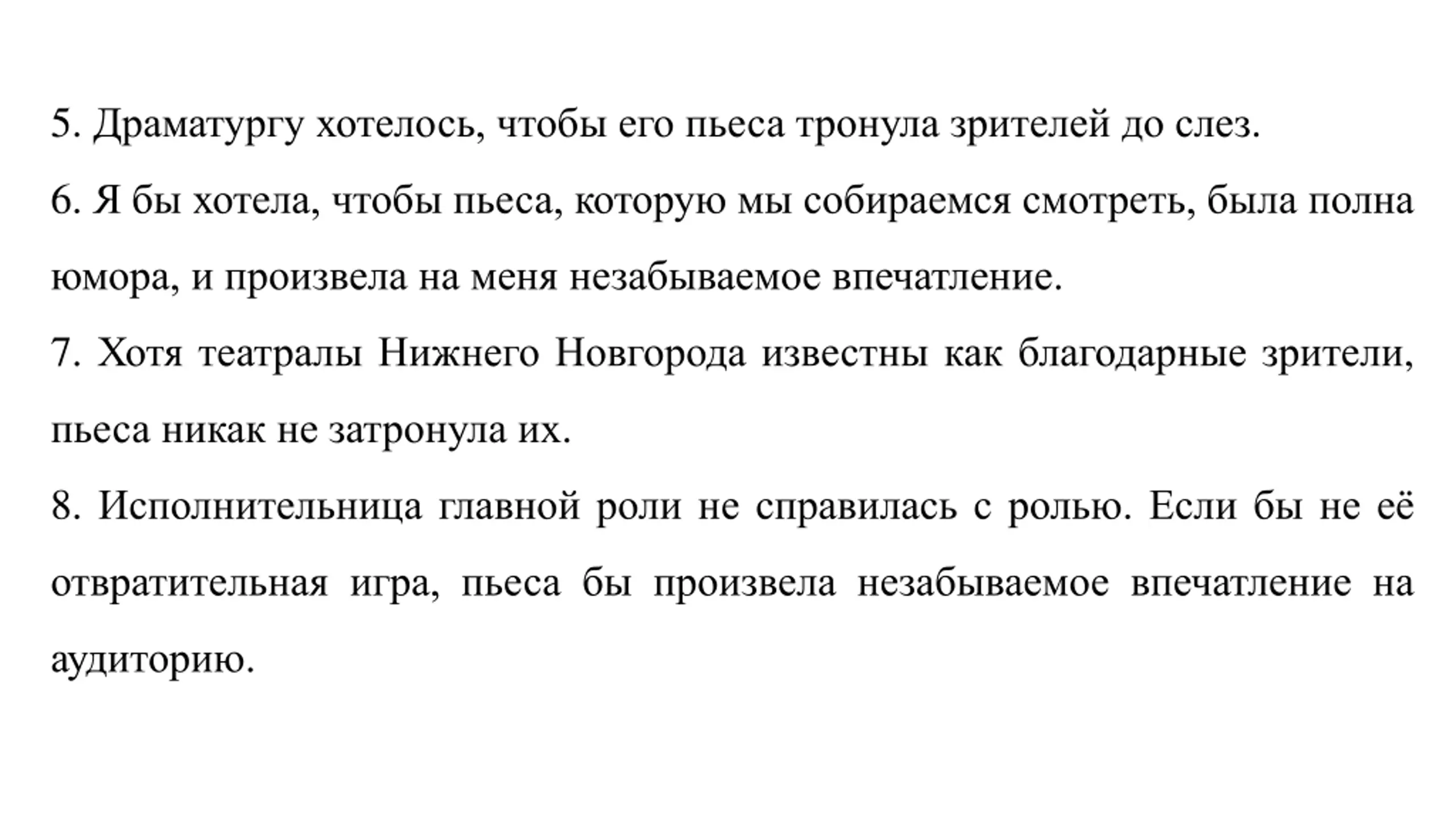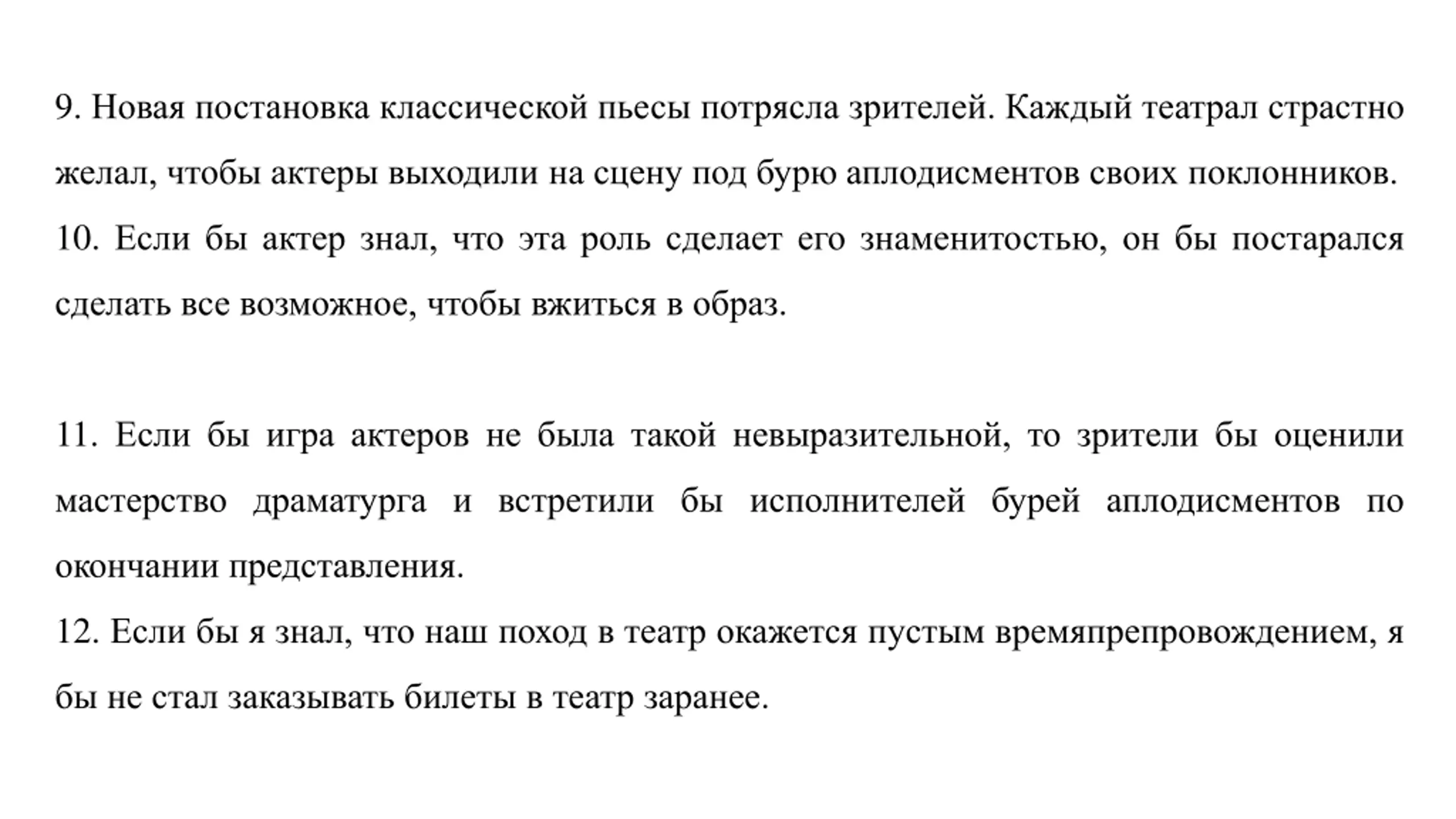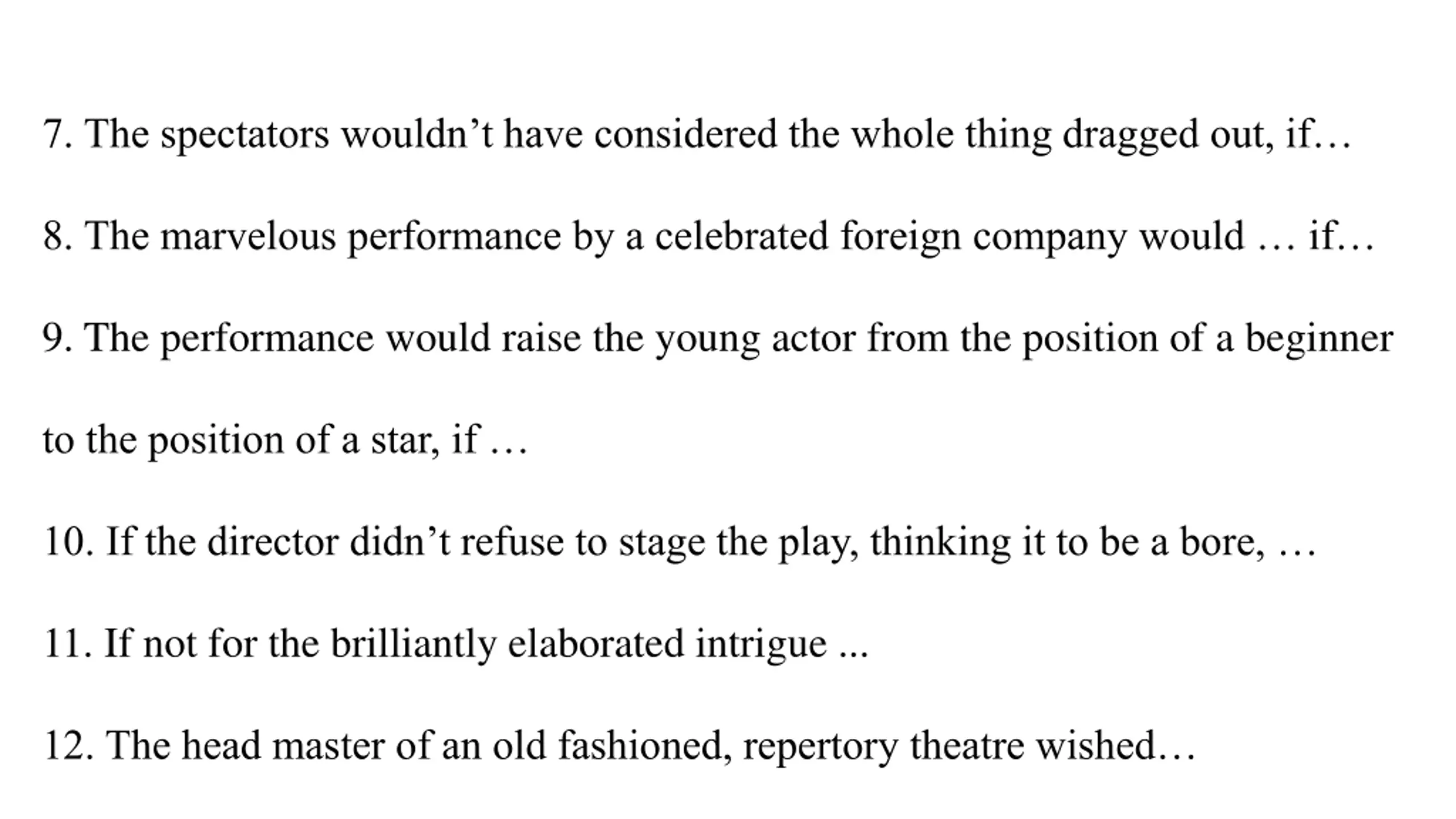 7. The spectators wouldnt have considered the whole thing dragged out, if 8. The marvelous performance by a celebrated foreign company would if 9. The performance would raise the young actor from the position of a beginner to the position of a star, if 10. If the director didn t refuse to stage the play, thinking it to be a bore, 11. If not for the brilliantly elaborated intrigue ... 12. The head master of an old fashioned, repertory theatre wished