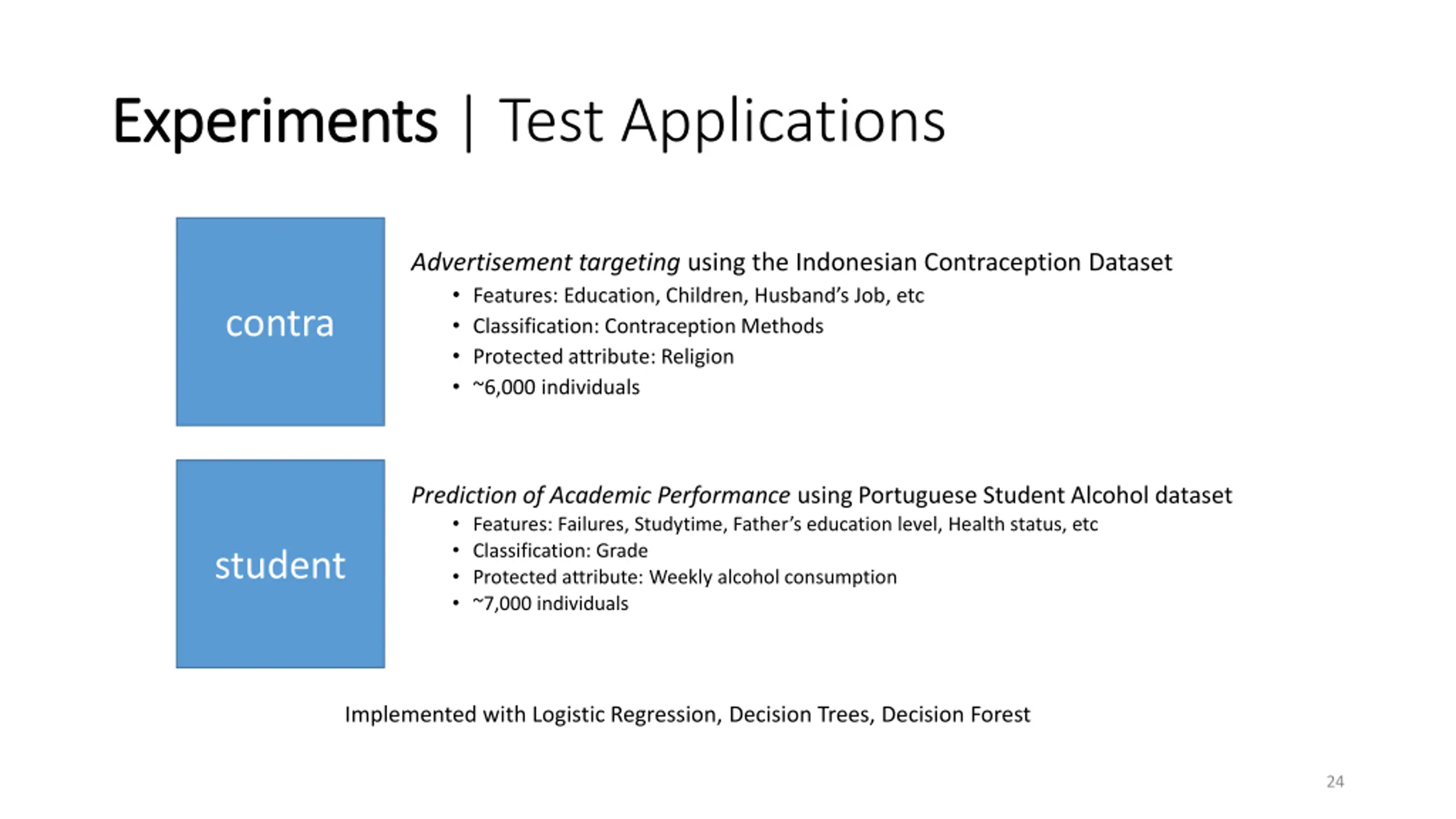 Experiments Experiments | Test Applications Advertisement targeting using the Indonesian Contraception Dataset Features: Education, Children, Husband s Job, etc Classification: Contraception Methods Protected attribute: Religion ~6,000 individuals contra Prediction of Academic Performance using Portuguese Student Alcohol dataset Features: Failures, Studytime, Father s education level, Health status, etc Classification: Grade Protected attribute: Weekly alcohol consumption ~7,000 individuals student Implemented with Logistic Regression, Decision Trees, Decision Forest 24