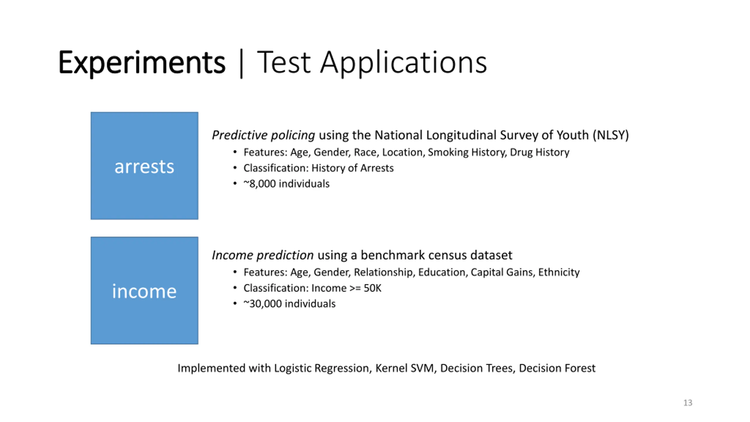 Experiments Experiments | Test Applications Predictive policing using the National Longitudinal Survey of Youth (NLSY) Features: Age, Gender, Race, Location, Smoking History, Drug History Classification: History of Arrests ~8,000 individuals arrests Income prediction using a benchmark census dataset Features: Age, Gender, Relationship, Education, Capital Gains, Ethnicity Classification: Income >= 50K ~30,000 individuals income Implemented with Logistic Regression, Kernel SVM, Decision Trees, Decision Forest 13