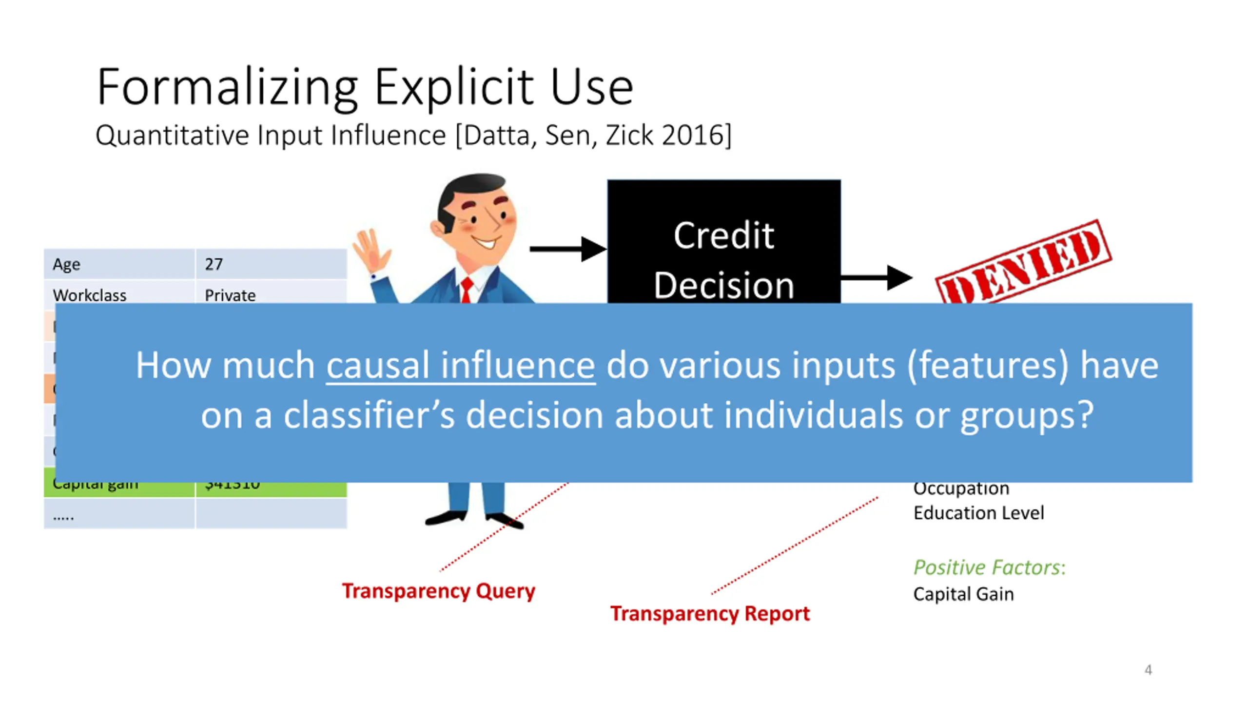 Formalizing Explicit Use Quantitative Input Influence [Datta, Sen, Zick 2016] Credit Decision Algorithm Age Age 27 27 Workclass Workclass Private Private Education Education Preschool Preschool How much causal influence do various inputs (features) have Marital Status Marital Status Married Married Occupation Occupation Farming-Fishing Farming-Fishing on a classifier s decision about individuals or groups? Race Race White White Because Okay but why? Gender Gender Male Male Negative Factors: Occupation Education Level Capital gain Capital gain $41310 $41310 .. .. Positive Factors: Capital Gain Transparency Query Transparency Report 4