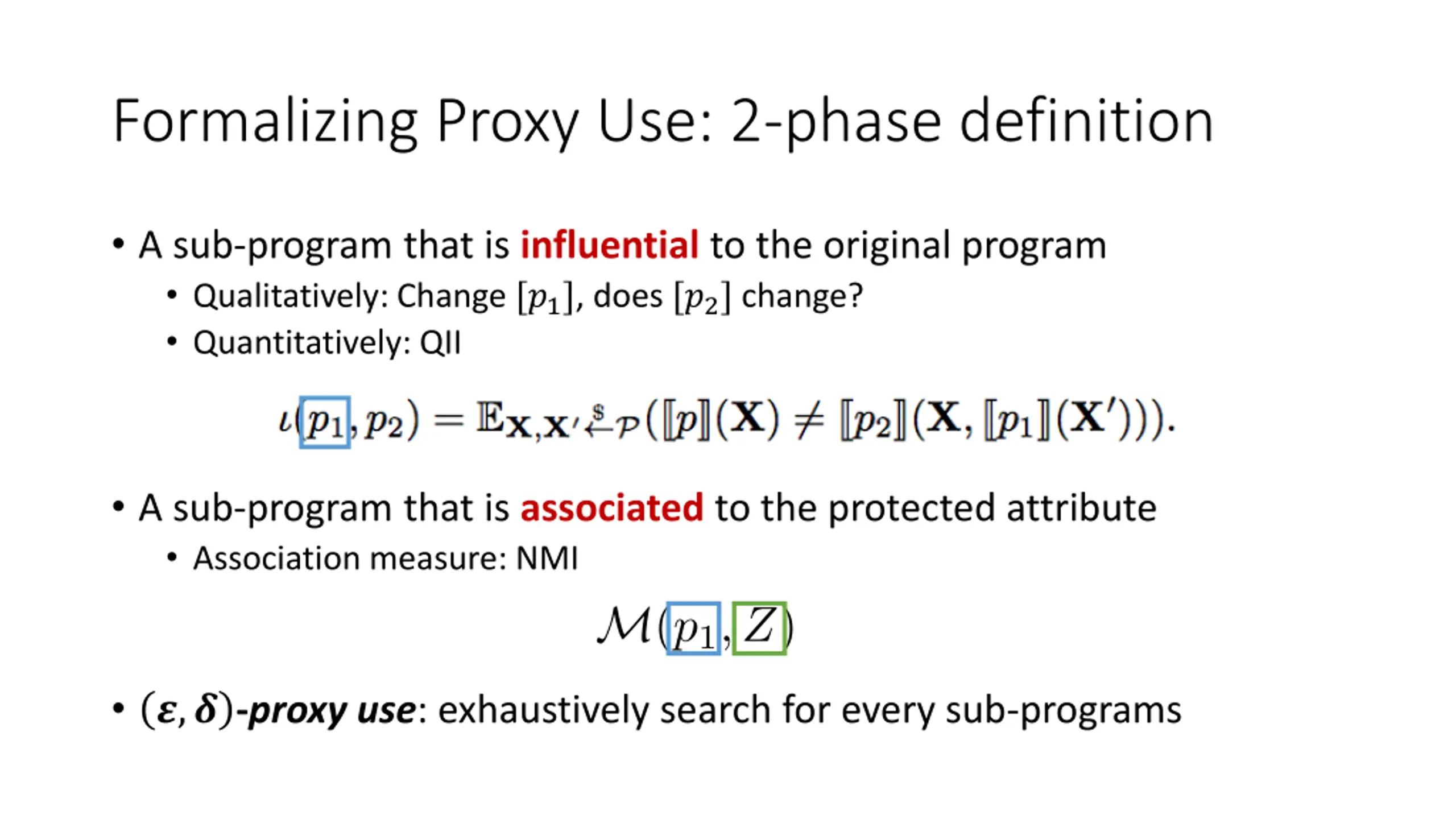 Formalizing Proxy Use: 2-phase definition A sub-program that is influential to the original program Qualitatively: Change [?1], does [?2] change? Quantitatively: QII A sub-program that is associated to the protected attribute Association measure: NMI ?,? -proxy use: exhaustively search for every sub-programs
