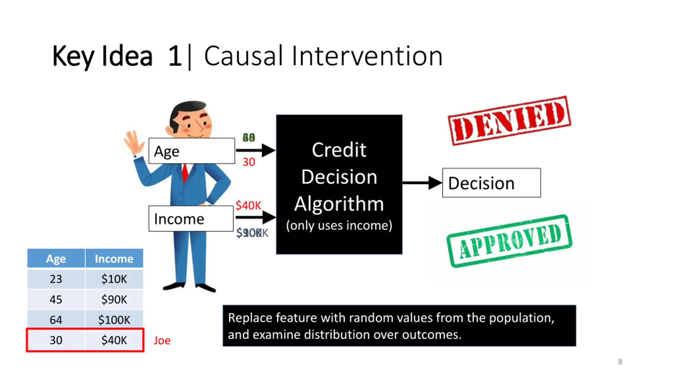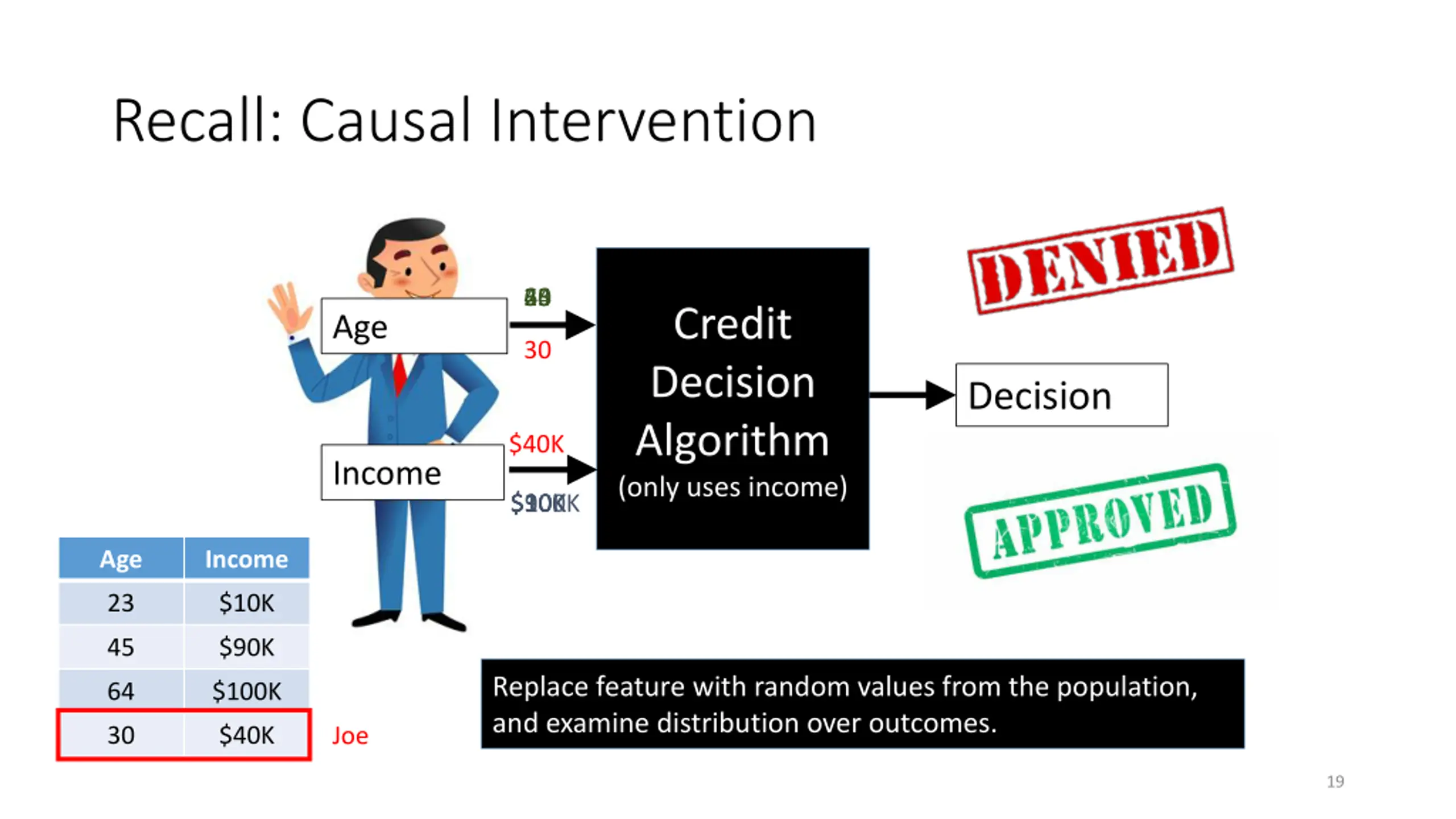 Recall: Causal Intervention 23 45 64 30 Credit Decision Algorithm (only uses income) Age 30 Decision $40K Income $10K $90K $100K $30K Age Income 23 $10K 45 $90K Replace feature with random values from the population, and examine distribution over outcomes. 64 $100K 30 $40K Joe 19