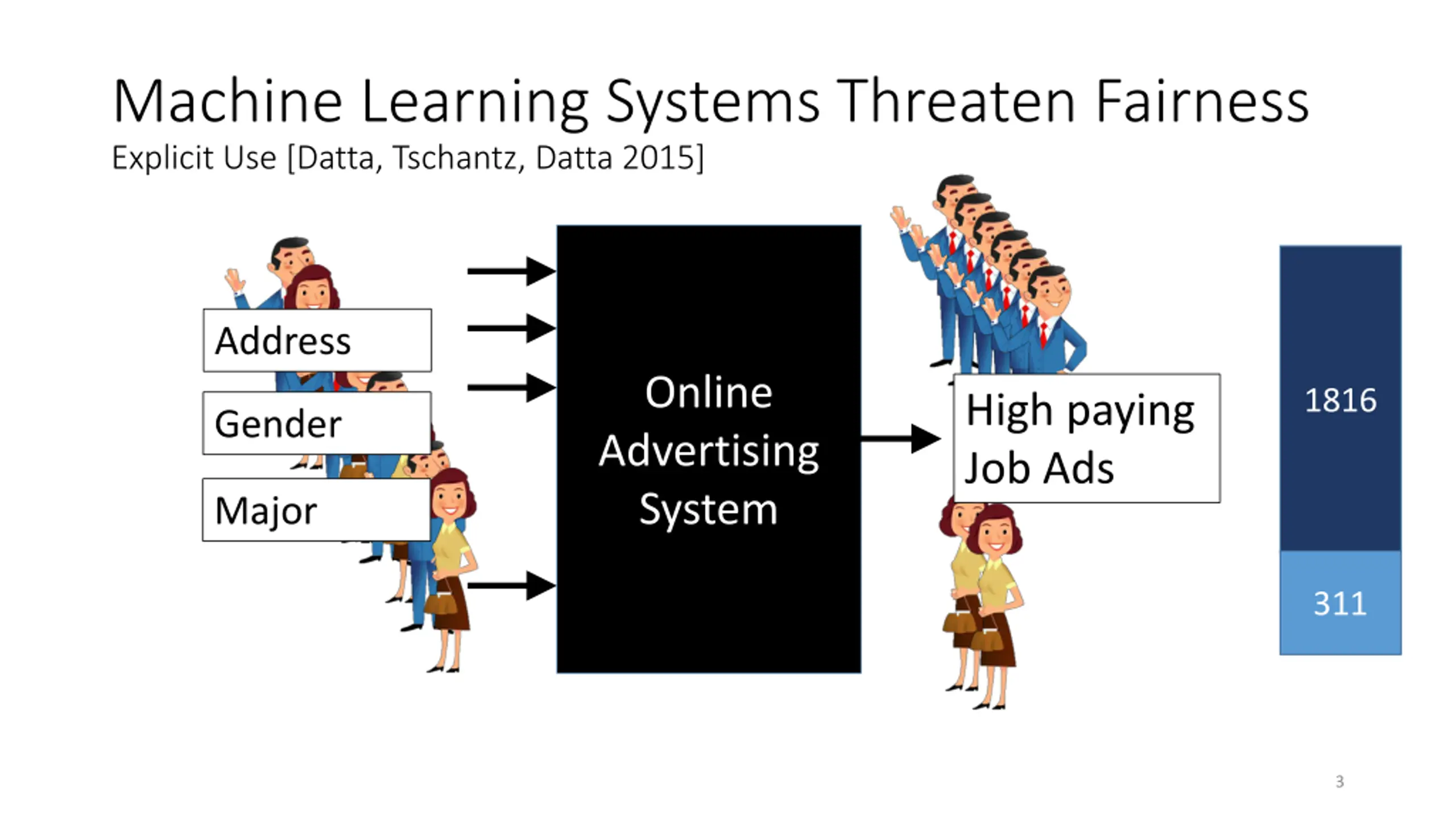 Machine Learning Systems Threaten Fairness Explicit Use [Datta, Tschantz, Datta 2015] Address Online Advertising System 1816 High paying Job Ads Gender Major 311 3