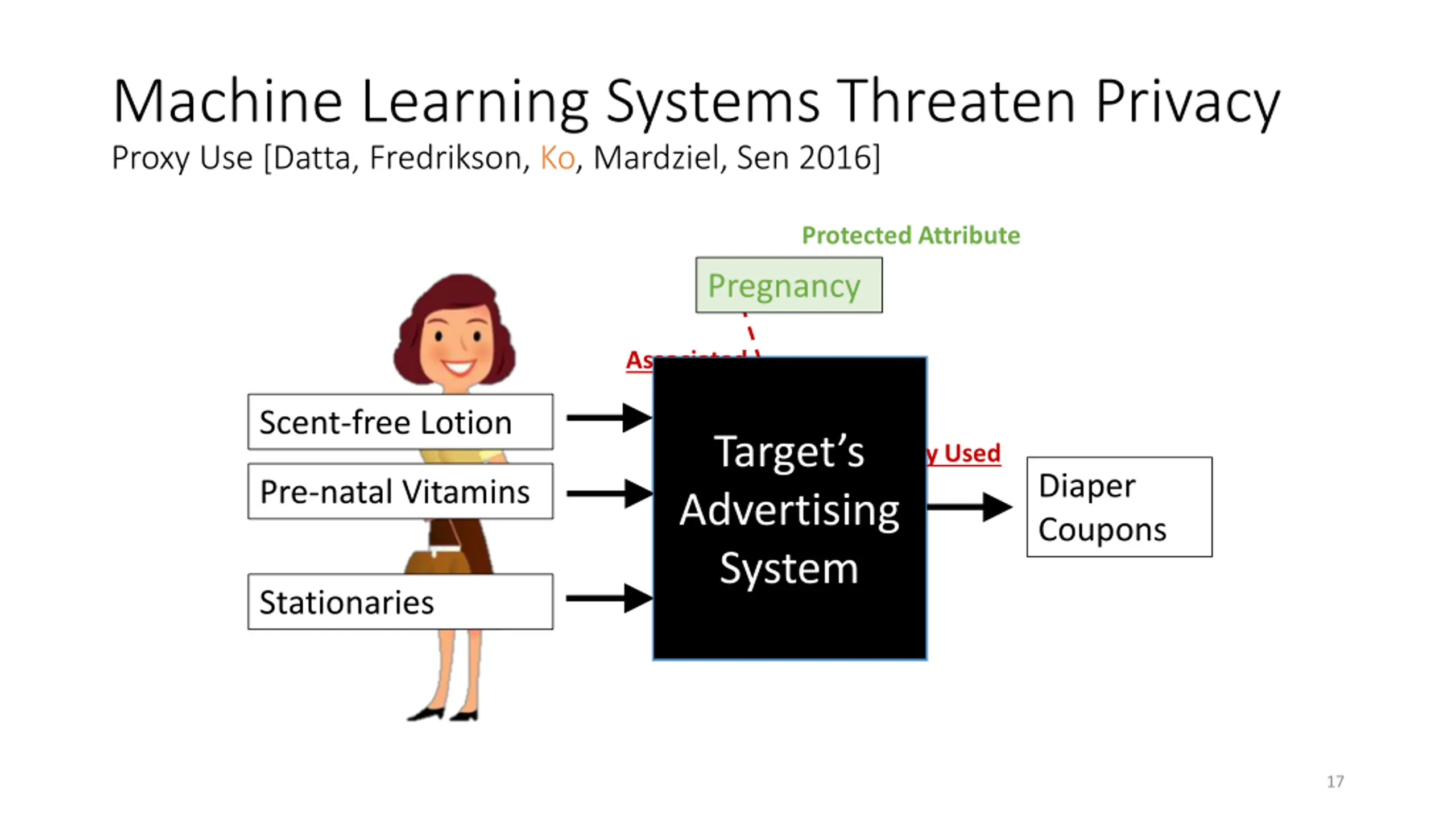 Machine Learning Systems Threaten Privacy Proxy Use [Datta, Fredrikson, Ko, Mardziel, Sen 2016] Protected Attribute Pregnancy Associated Scent-free Lotion Target s Advertising System Causally Used Diaper Coupons Pre-natal Vitamins Stationaries 17