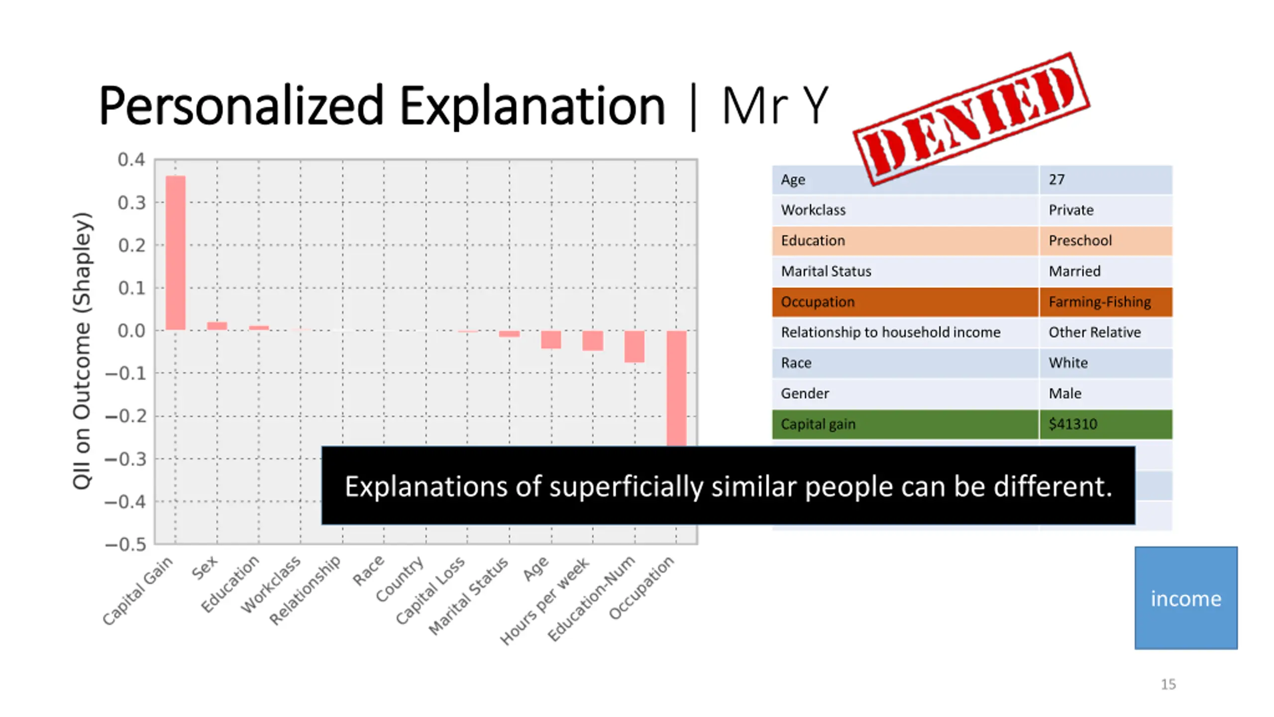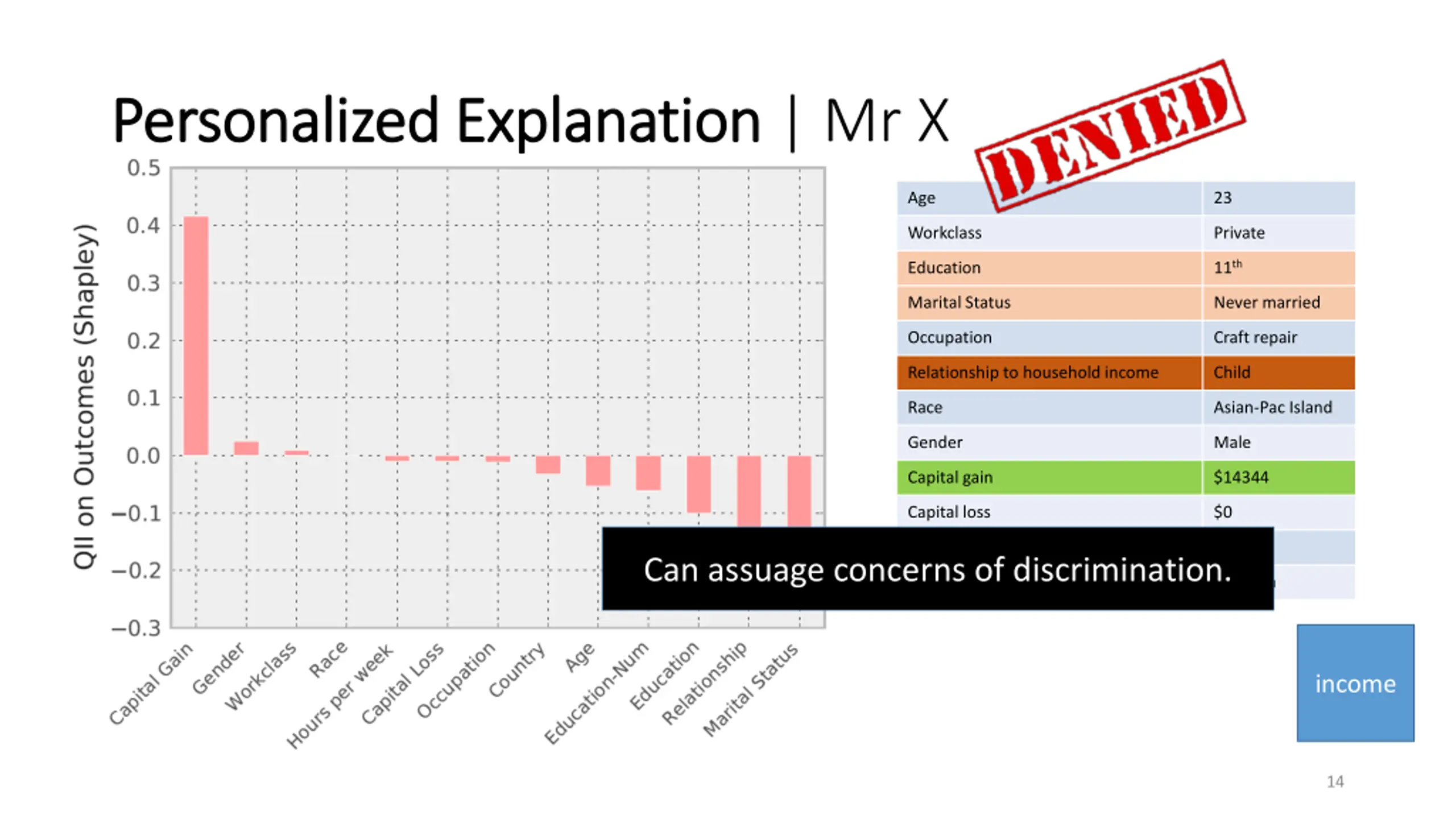Personalized Explanation Personalized Explanation | Mr X Age Age 23 23 Workclass Workclass Private Private 11th 11th Education Education Marital Status Marital Status Never married Never married Occupation Occupation Craft repair Craft repair Relationship to household income Relationship to household income Child Child Race Race Asian-Pac Island Asian-Pac Island Gender Gender Male Male Capital gain Capital gain $14344 $14344 Capital loss Capital loss $0 $0 Work hours per week Work hours per week 40 40 Can assuage concerns of discrimination. Country Country Vietnam Vietnam income 14
