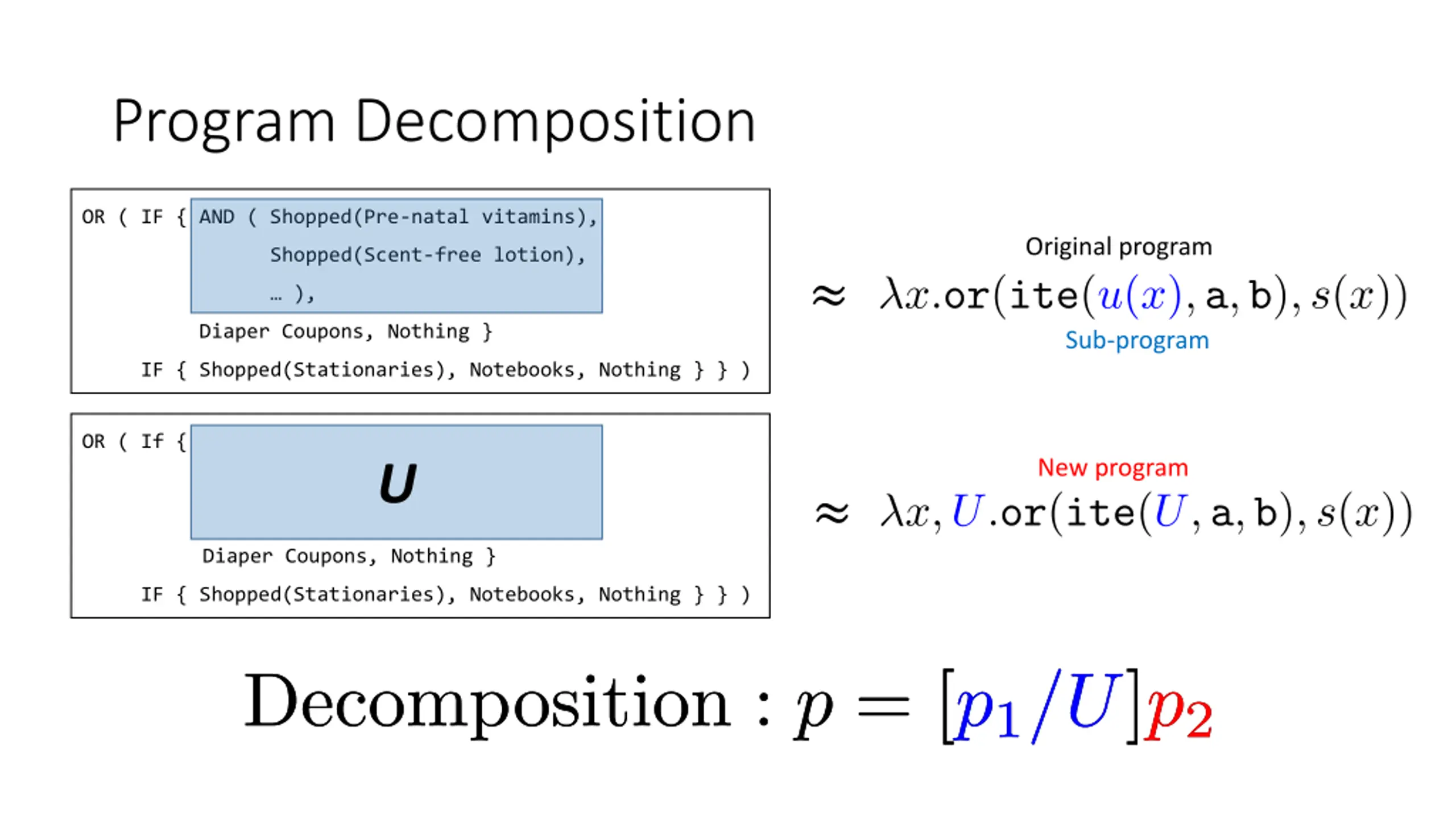 Program Decomposition OR ( IF { AND ( Shopped(Pre-natal vitamins), Original program Shopped(Scent-free lotion), ), Diaper Coupons, Nothing } Sub-program IF { Shopped(Stationaries), Notebooks, Nothing } } ) OR ( If { New program U Diaper Coupons, Nothing } IF { Shopped(Stationaries), Notebooks, Nothing } } )
