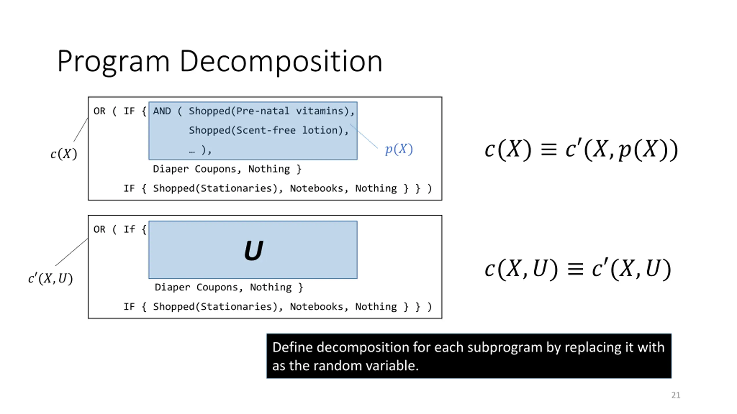 Program Decomposition OR ( IF { AND ( Shopped(Pre-natal vitamins), Shopped(Scent-free lotion), ?(?) ? (?,?(?)) ?(?) ), ? ? Diaper Coupons, Nothing } IF { Shopped(Stationaries), Notebooks, Nothing } } ) OR ( If { U ?(?,?) ? (?,?) ? (?,?) Diaper Coupons, Nothing } IF { Shopped(Stationaries), Notebooks, Nothing } } ) Define decomposition for each subprogram by replacing it with as the random variable. 21